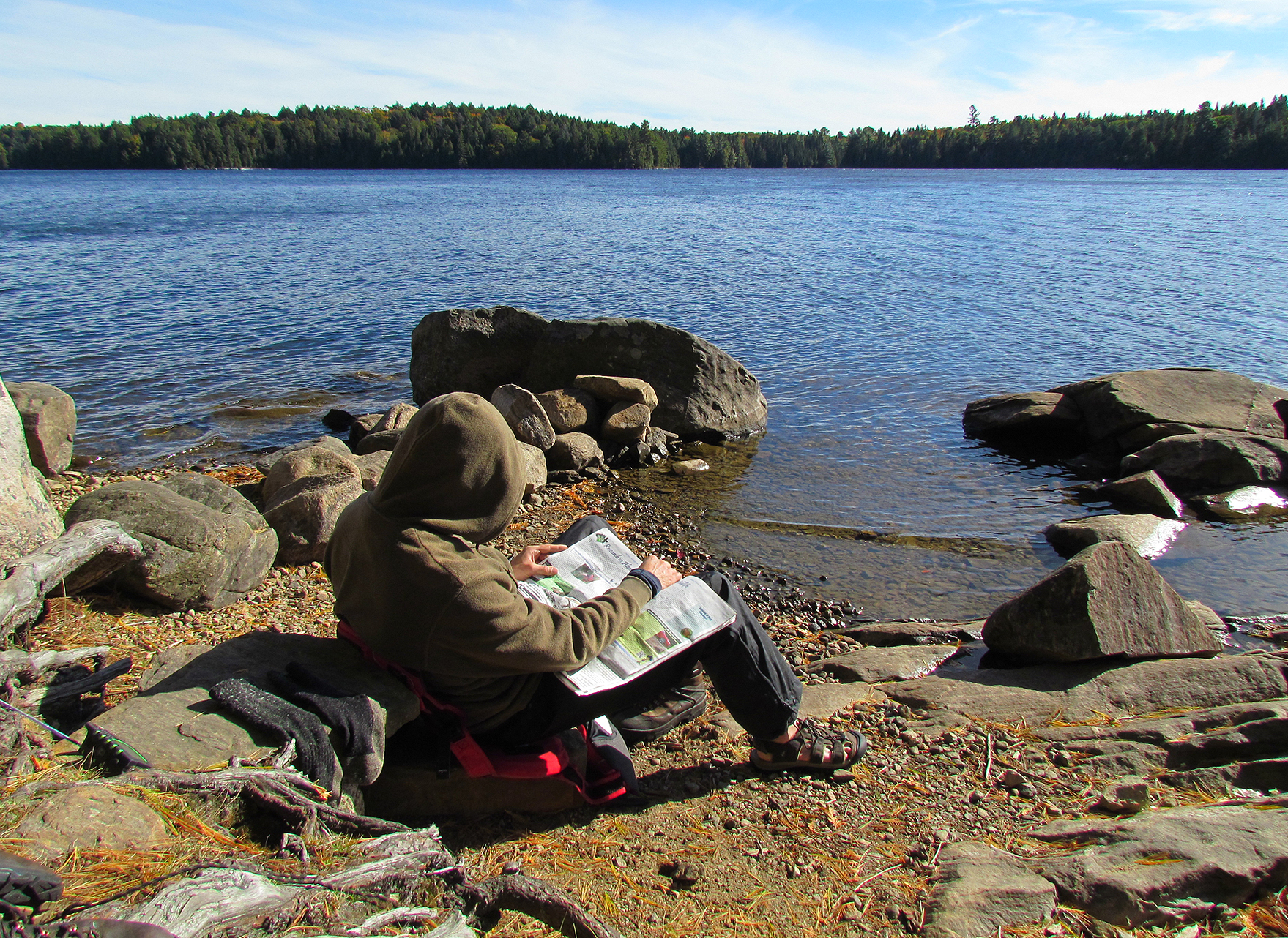 The wind died down last evening when we went to bed, however through the night and into the early morning it picked up yet again. We set our watch for 5:55 am but when the alarm went off and we heard the wind gusts we decided that we were not getting a head start after all. After dawn we decided to stay at the site for yet another day as the winds were still strong out of the northeast which was the direction we were to go all day today. After a homemade pancake for breakfast we retreated to our sheltered flat rocks at the shoreline again for some tea with some added leftover pancake syrup poured in. The morning was quite cool and around 10 degrees colder than forecasted. Marianne didn’t pack her fleece this trip and though she never got too cold, it would have been nice to have.