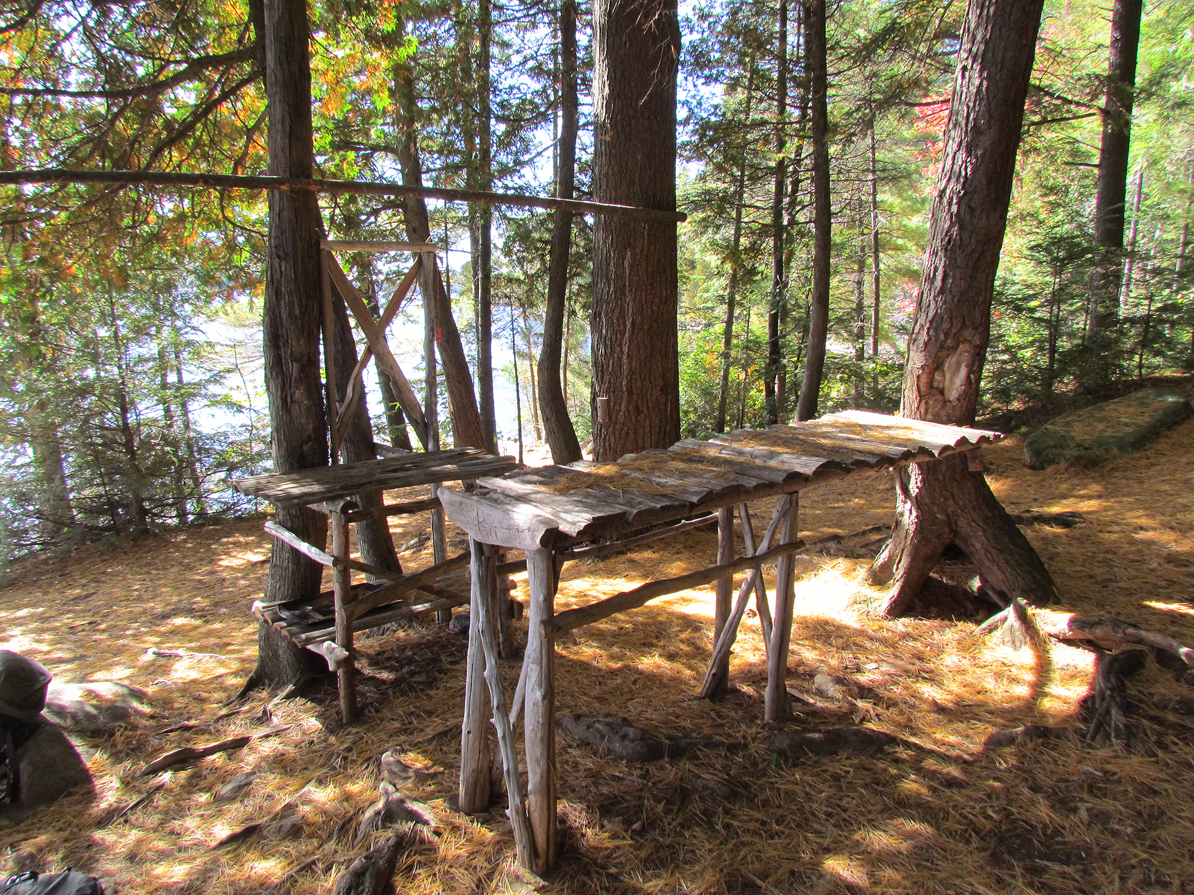 After packing up the canoe there were already whitecaps beginning to form on the water. Today we were heading northeast to Otterslide Lake, which just so happened to be today’s wind direction. We were used to headwinds from last year’s trip in Quetico Provincial Park so we figured this would be just a minor set back. It was a slow go for us at first and we even saw the rowdy group of teens from yesterday battling against the wind as well. Lucky for them they were heading to Jay Lake so their ordeal would soon be over. We continued to head northeast against the wind all the while we strategically hid behind islands and stayed close to shore to keep out of the full force of the wind. When we rounded a peninsula and got out onto the unavoidable open water we were hit straight on with winds gusting to 40 kilometres per hour! There was no way we could go any further. We turned around and headed to the closest campsite along Burnt Island’s northern shore. We were only out for an hour and a half this morning and maybe paddled 2 kilometres. This campsite, we had to admit was nicer than the one from last night. It was a small point on the mainland and was fairly large with a table and what looked like a vanity?