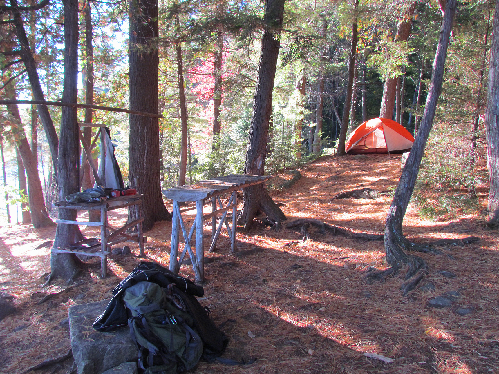 On our first day we arrived at the Canoe Lake launch around 10:00am. After checking out the Portage Store, picking up our permits, and unloading the canoe, it began to rain. Even though we arrived on a Tuesday there were quite a few people at the launch which included a group of around 20 teenagers. We also saw our first “leafers”, those individuals that come by the busloads to view and photograph the fall colours in central Ontario. Lucky for us, the typical leafer does not venture into the backcountry.