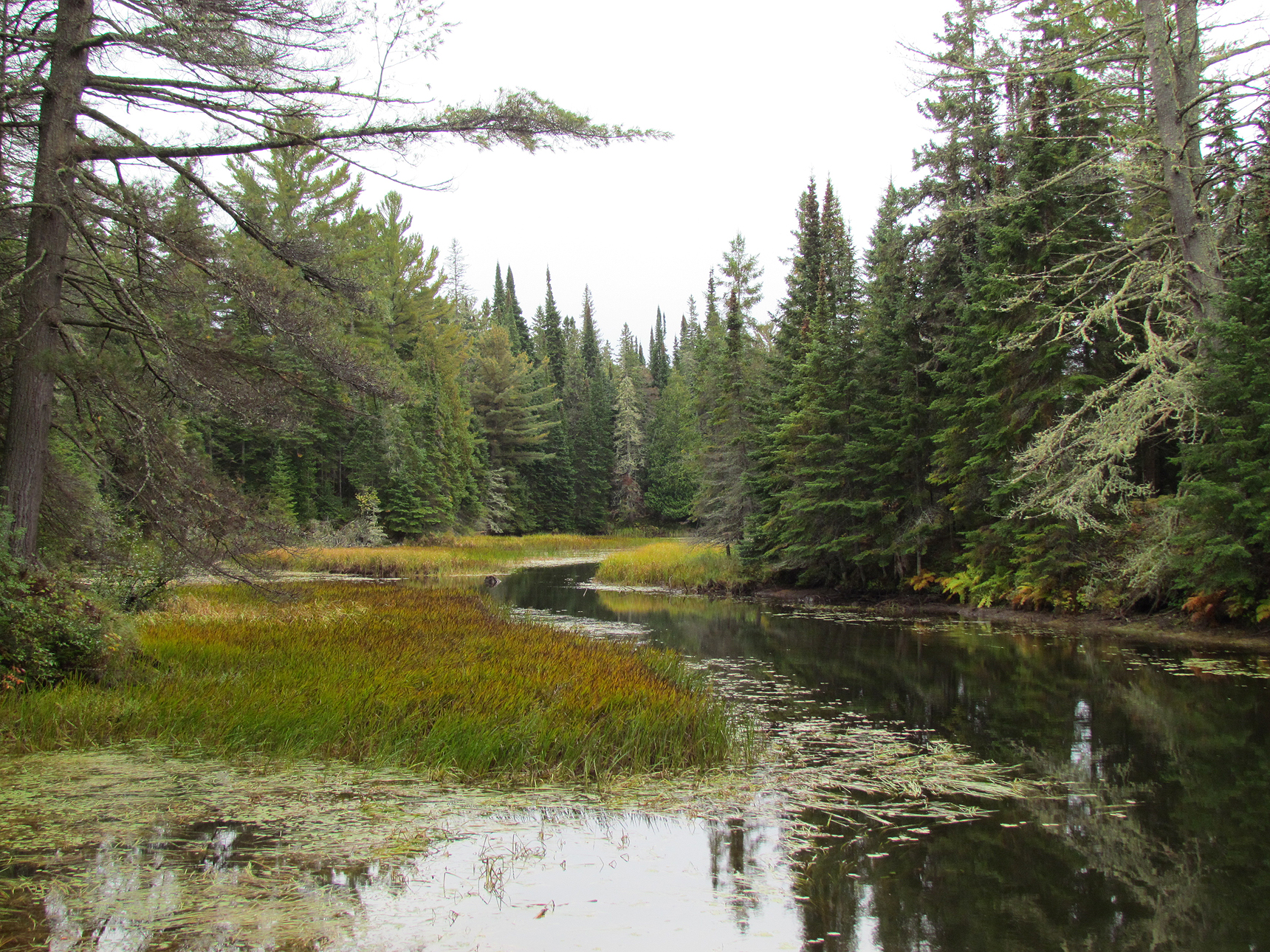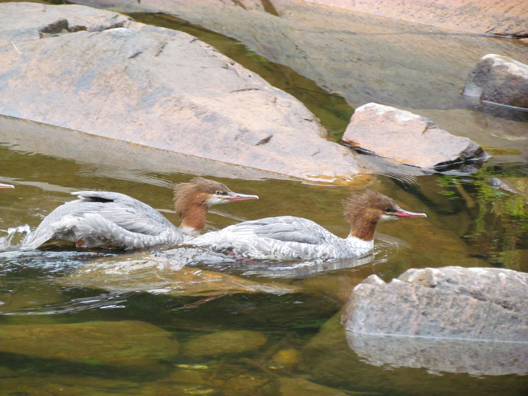 Back in the canoe we continued to our first portage, a 290 metre around a dam into Joe Lake. It was here we caught up to the rowdy teenagers and thankfully we got a head of them before they had a chance to enter Joe Lake. Paddling northeast up the eastern arm of Joe Lake into Little Joe Lake we caught a glimpse of the Arowhon Pine Lodge. Soon the lake began to narrow and after a small portage of 120 metres we continued down a creek. Here we met a group of Common Mergansers.