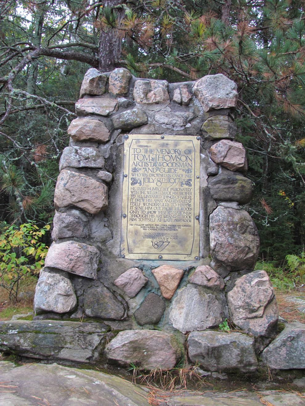 Besides hosting some cottages, Canoe Lake may be most famous as the location where famed painter Tom Thomson died in 1917. Thomson frequented Algonquin Park and many of his famous paintings were created within the park. His canoe, and later his body were found on Canoe Lake under what appeared to be mysterious circumstances. A memorial cairn now stands along Canoe Lake’s eastern shoreline. We went ashore and climbed up some rocks to catch a glimpse of the cairn, along with a totem.