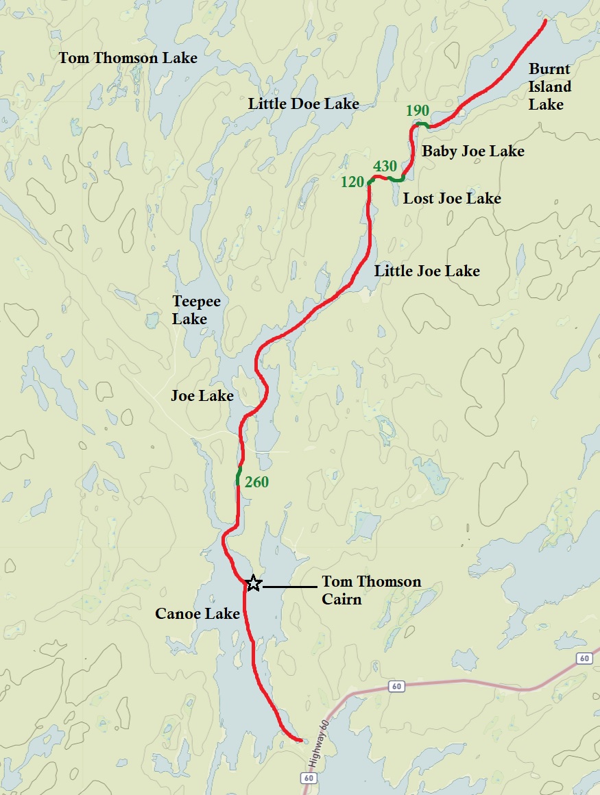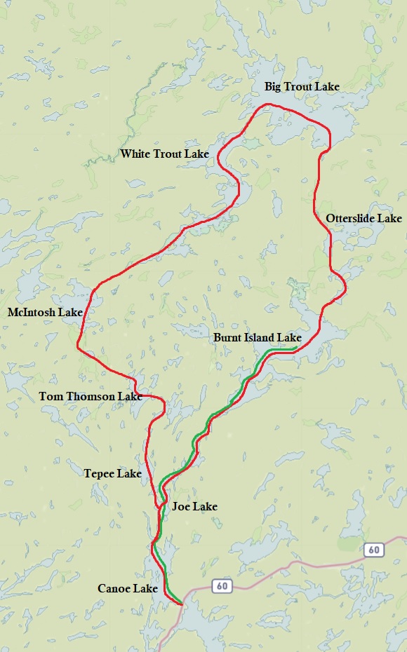 Route: Canoe Lake – Joe Lake – Little Joe Lake – Baby Joe Lake – Burnt Island Lake – Little Otterslide Lake – Otterslide Lake – Big Trout Lake – White Trout Lake – Grassy Bay – McIntosh Creek – McIntosh Lake – Ink Lake – Tom Thomson Lake – Little Doe Lake – Tepee Lake – Joe Lake – Canoe Lake