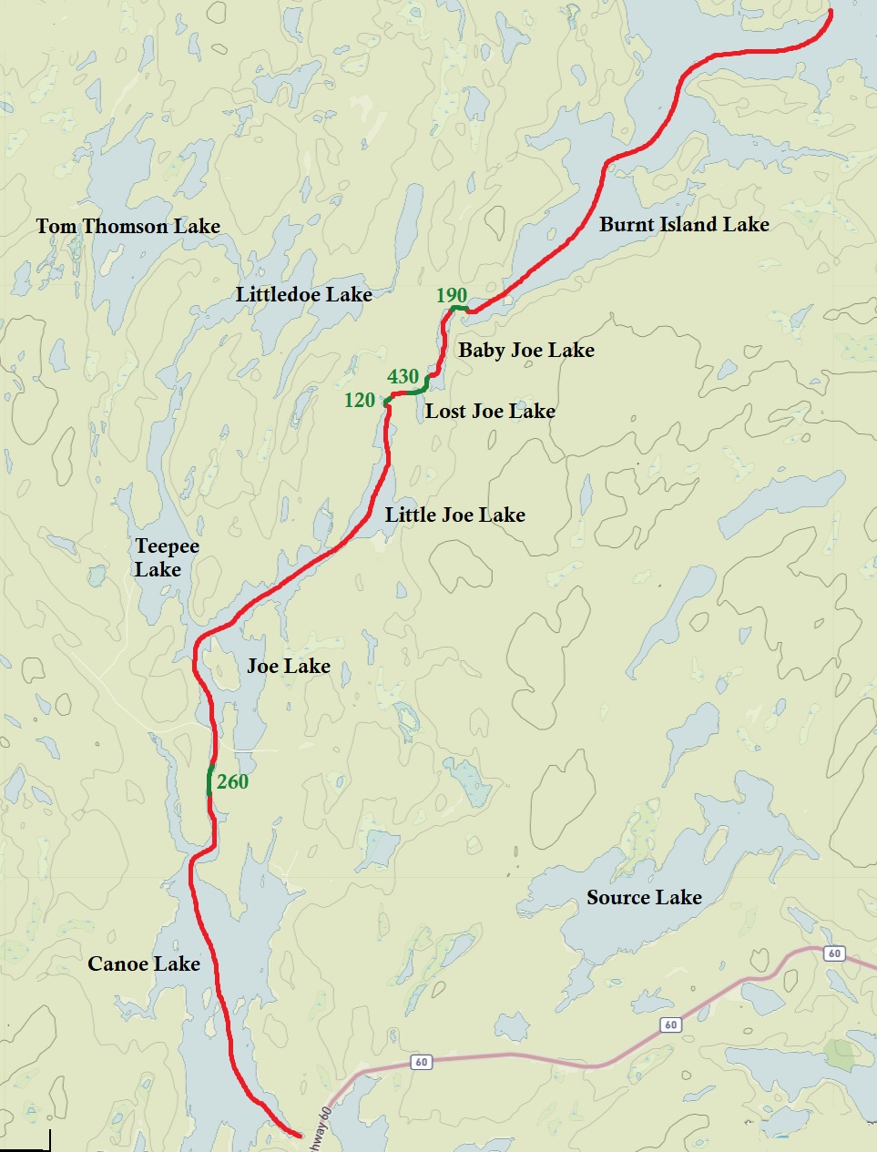 Longest Portage: 430 metres (Lost Joe to Baby Joe Lake)