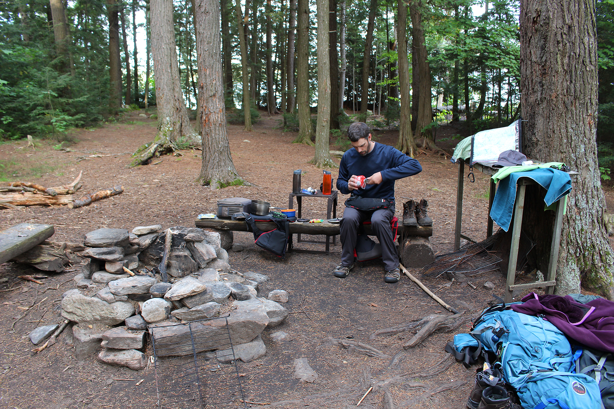 Happy Isle Lake is a pretty nice lake. We saw people at the island campsite, which was also the only island on the whole lake. We decided on the peninsula site on the north shore and arrived around 5:00 pm. It was a nice site with a flat spot for the tent, and the firepit was out of the wind at a lower section right next to the lake. We both planned to take a bath in the lake to take the stink off but the water was ridiculously cold, the kind of cold that actually hurts! After setting up the tent, it was time to chill and take in the peaceful evening at our site. We saw a couple trying their luck at fishing near the island campsite, while a pair of loons drifted by. As the breeze calmed we made a small smoky fire to ward off the bugs.