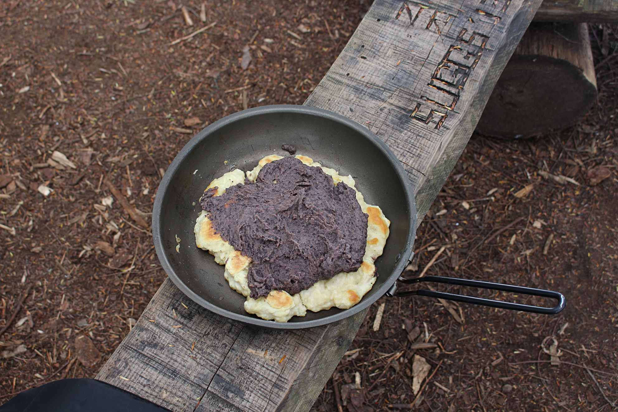 For lunch we made homemade bannock and added Mary Jane’s brand Black Bean Hummus. It tastes great, though visually it looks like someone dropped a big messy deuce on it.