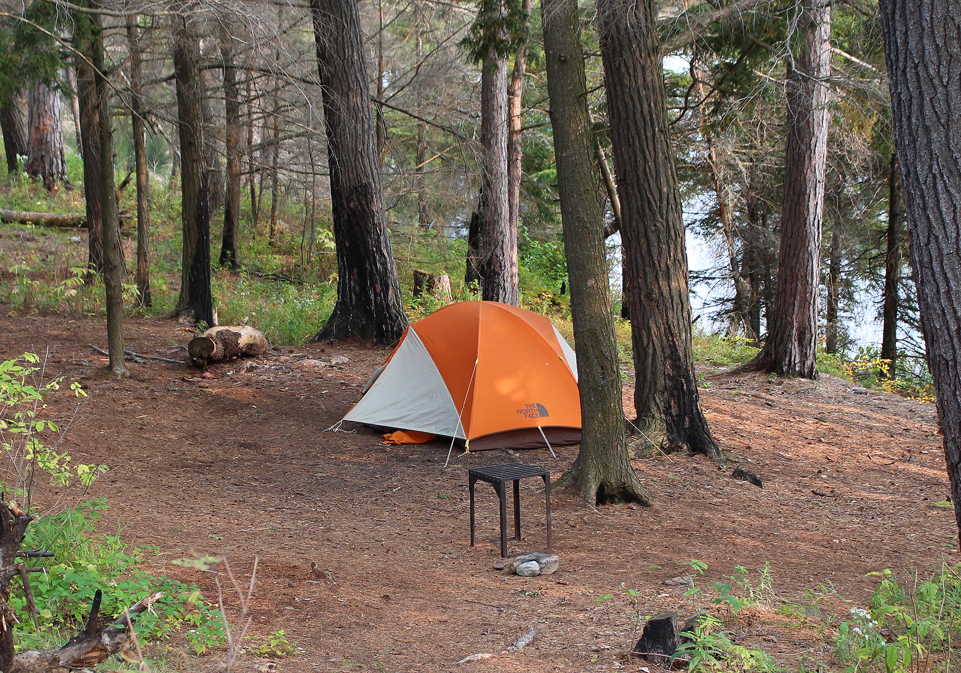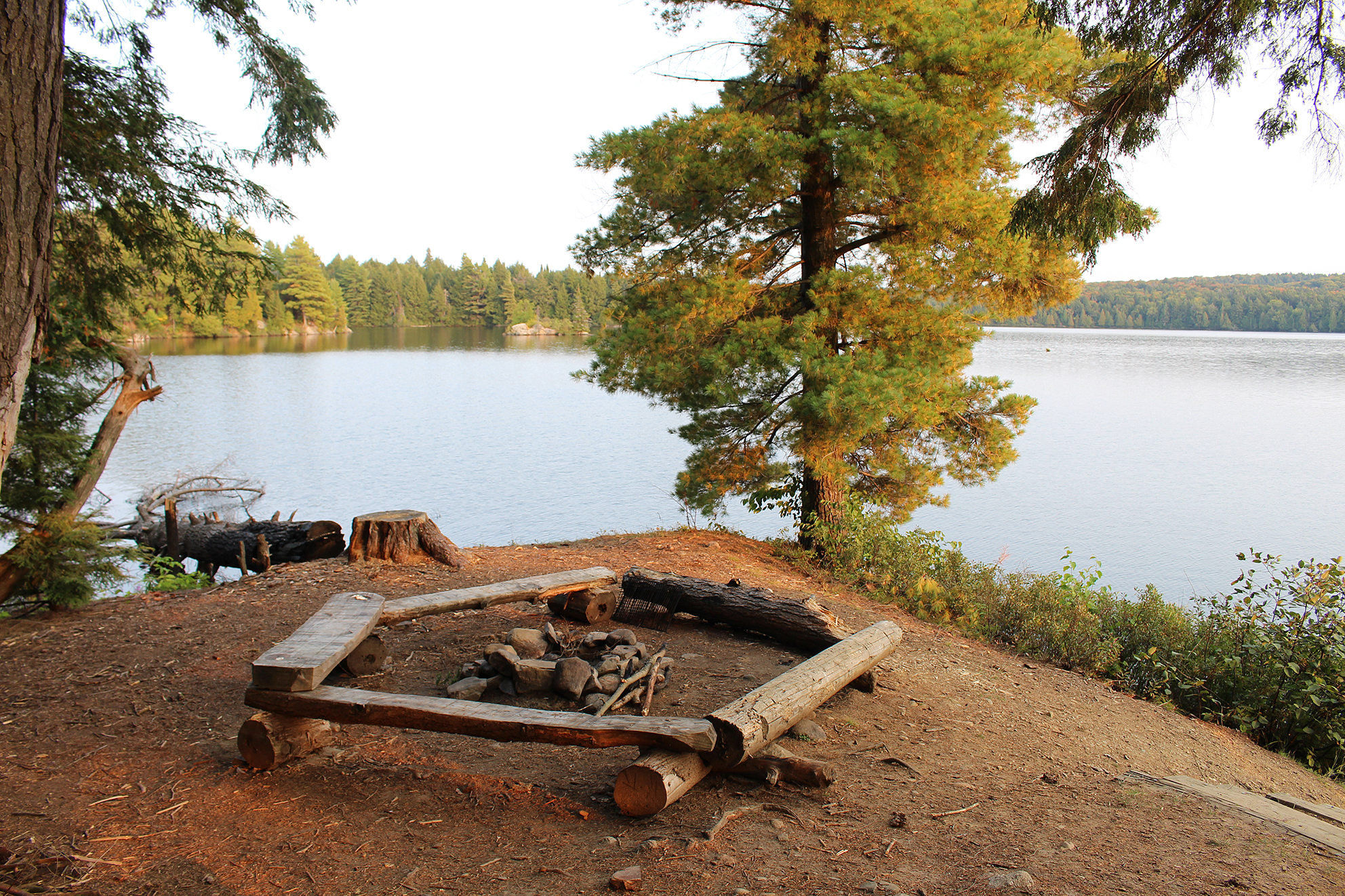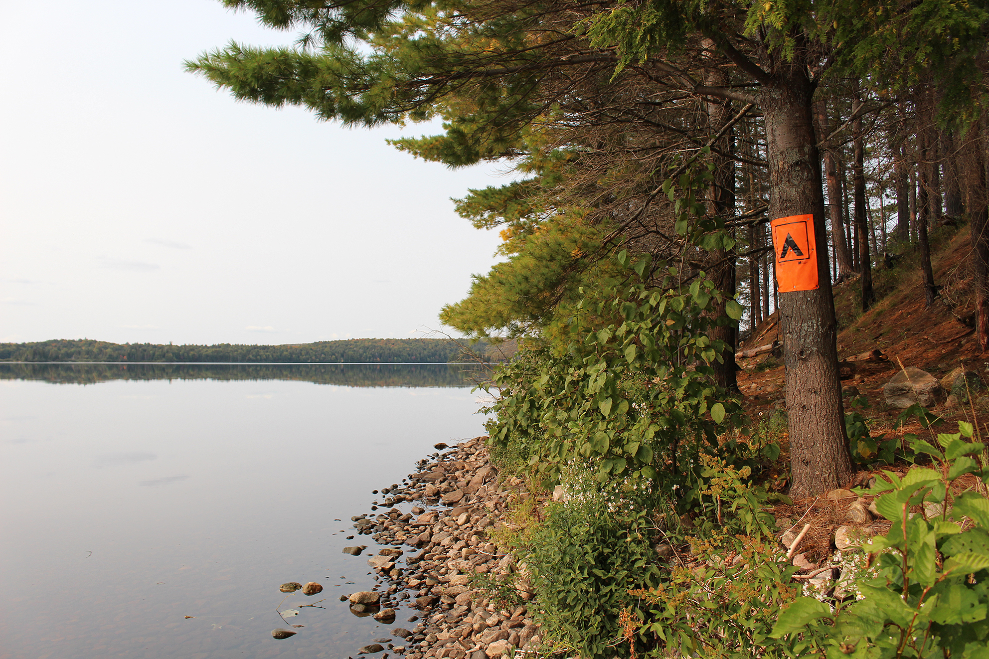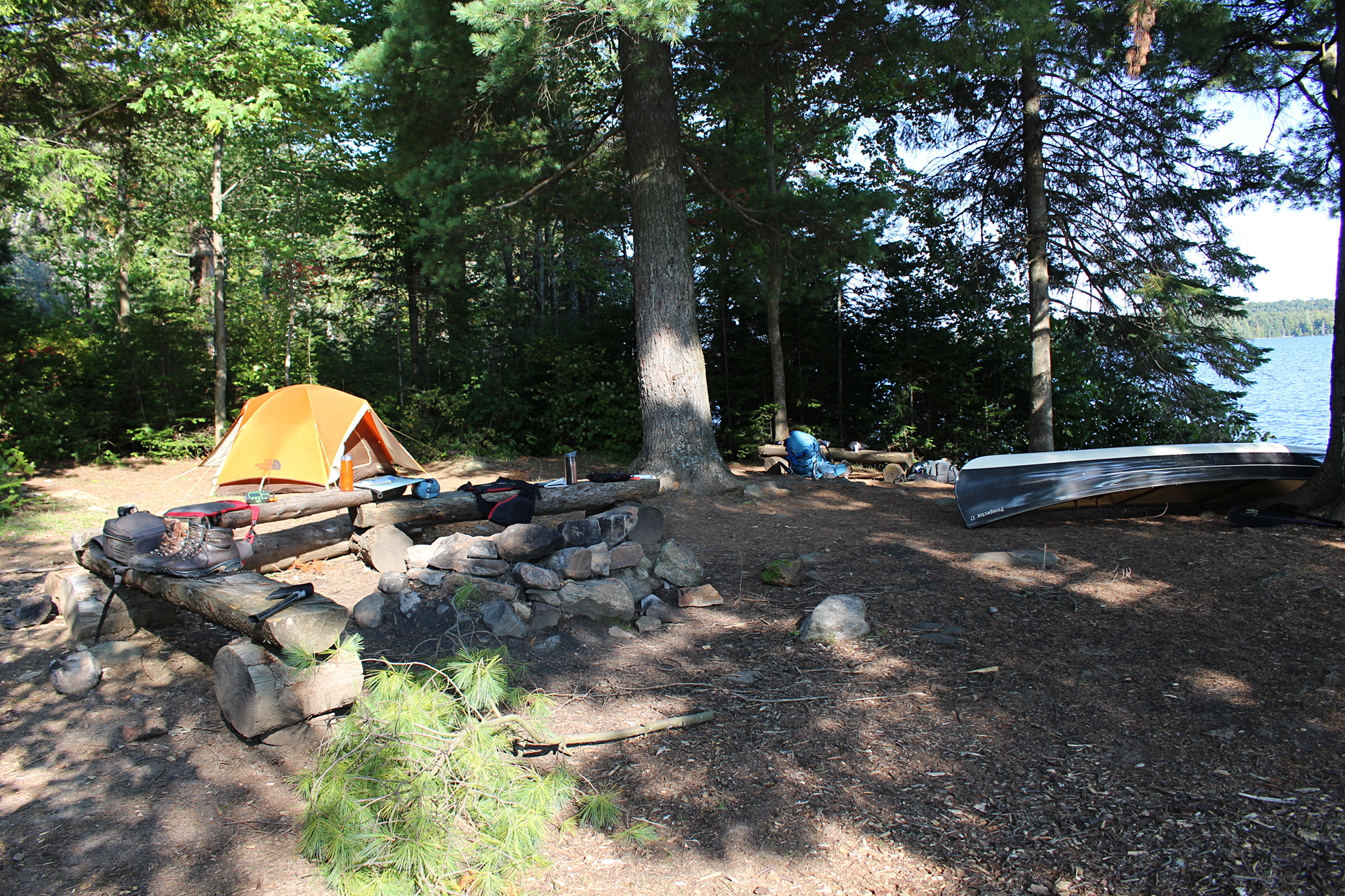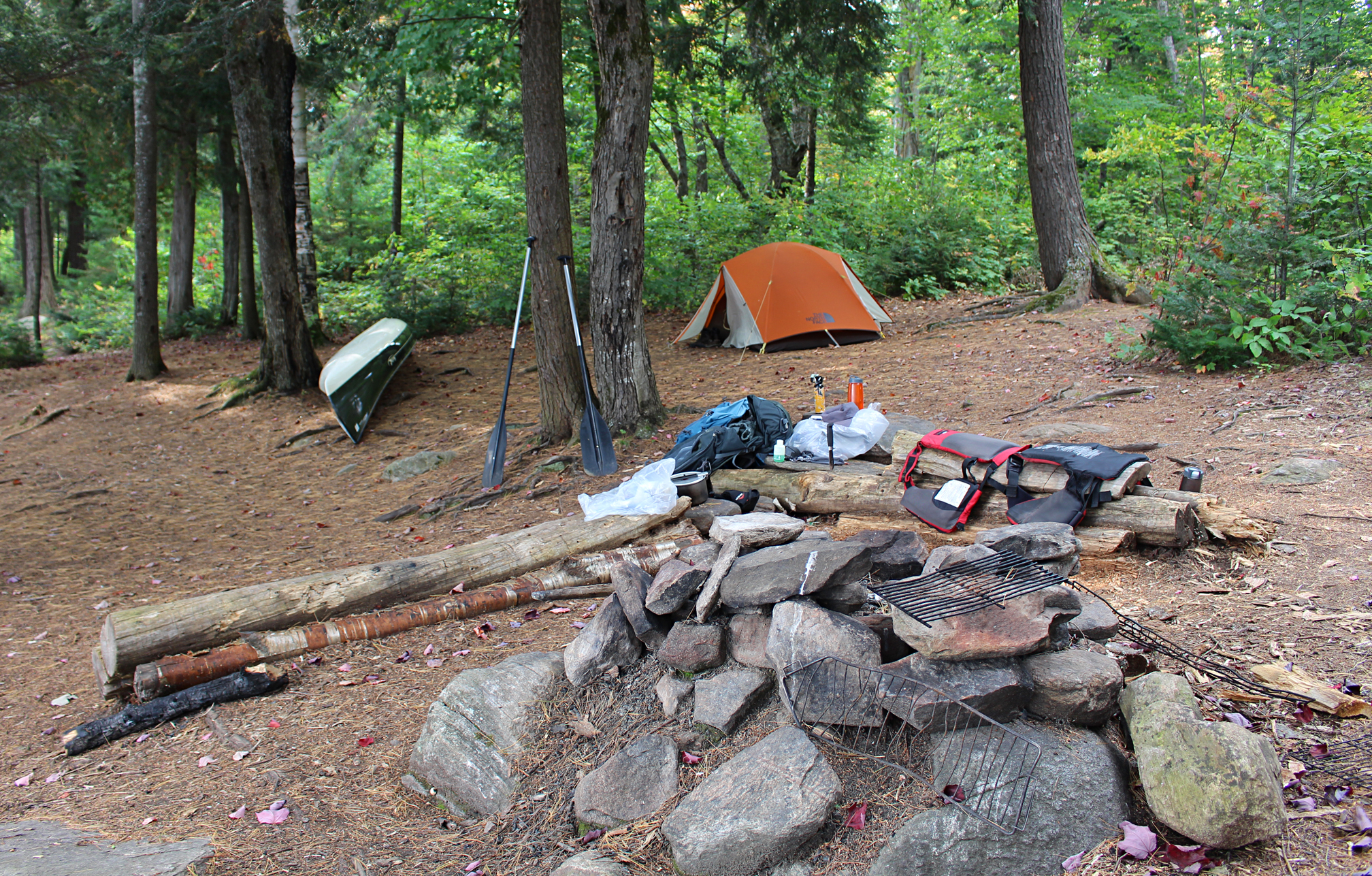 Fall colours greeted us here in more abundance than any other part of the trip with even a few maples already at 100% leaf change glowing with brilliant oranges and reds. We landed at a large island that held three sites, our site being in the middle well out of view of the other two. It was an okay site with a messy fire pit that had some garbage in it including tin cans. Over the top though were the nearly 10 grates that were scattered around the firepit and seating area. A fish hook was also found stabbed in a tree with the lure still attached. The spot for the tent was not completely level but it did the trick, and a nice flat shallow spot in the water for bathing is always welcome.