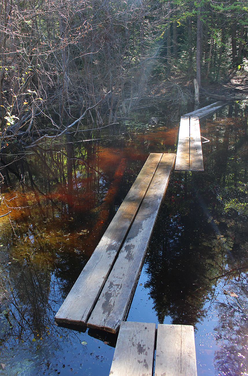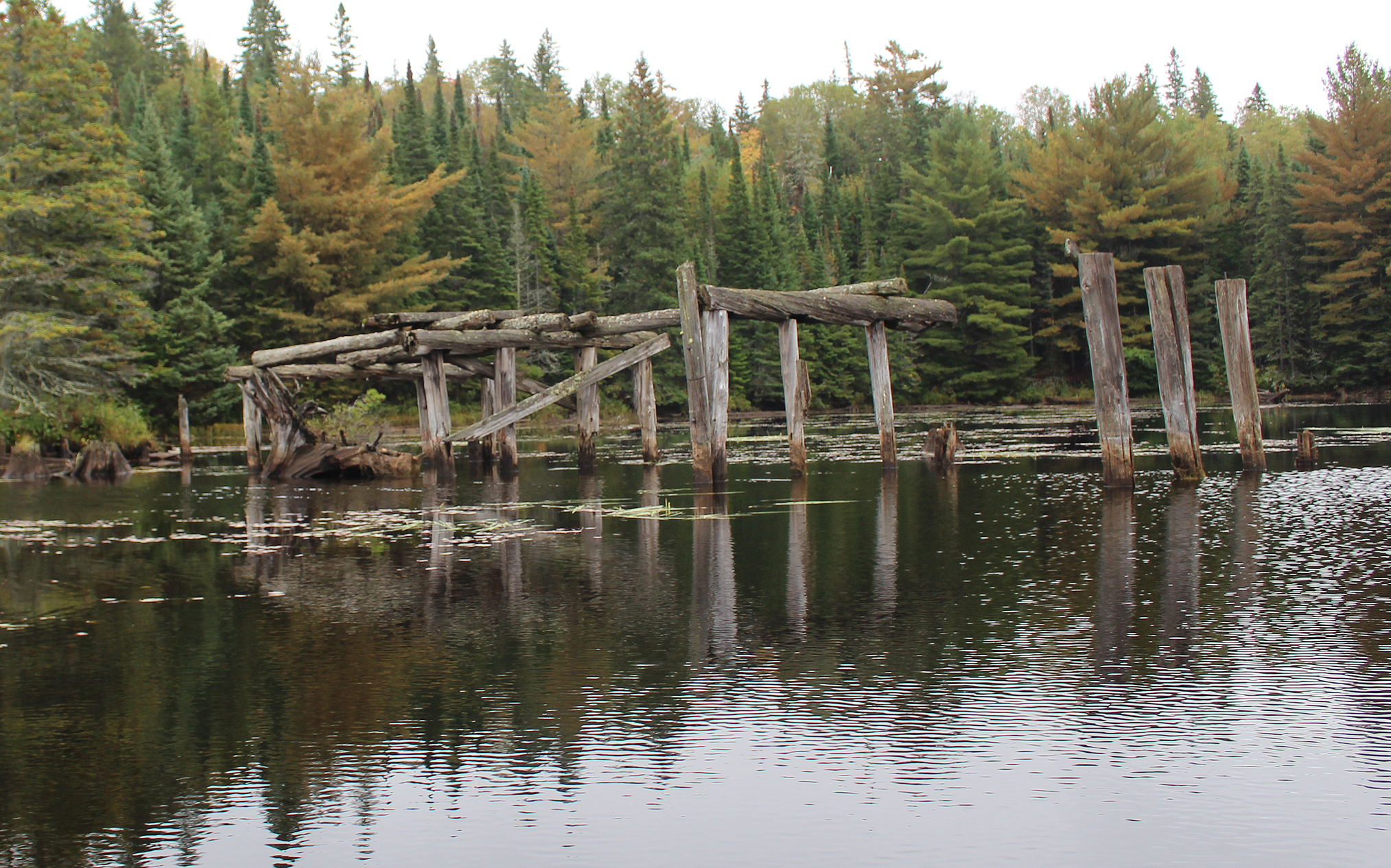 After a great breakfast of GORP and water (you can tell we just want to get going) we entered the lake just after 8:00 am. A short paddle south and it was back to the road for our next portage, a 740 metre into Potter Creek. Potter Creek acted more like a river with some fast moving water, and quite a few rocks! We tried to maneuver as best we could but it was very had to see the rocks when the water was moving so quickly, and we bounced and scrapped our way down the creek. Eventually we made it to what looked like a take out, but there was no portage sign. There was supposed to be two portages along this section according to our map. We decided that this was probably not the portage and pressed on which was a big mistake as the rocks became more numerous and we even got stuck on a rock with the rushing water attempting to dump our canoe! To make matters worse, Marianne had her new sunglasses bumped off her head and into the creek by an overhanging branch. Speaking of rocks, there was probably every colour of the rainbow painted on them along this section of Potter Creek from other canoes. We came across another take out, this time with a portage sign. When we got out of the canoe we quickly looked at the map and realized that what we thought earlier was maybe a portage was indeed the 95 metre portage we were supposed to take. The portage we were at now was a mere 65 metres around more rocks. After this portage, Potter Creek became less of a river and more of a calm winding creek that was easier to navigate. The last portage for the day, and for the whole trip, was a 390 metre around some rapids which was actually NOT muddy! A few more twists and turns and we were on our way back into Canoe Lake. While heading back to the launch we saw what remained of an old bridge built in the mid 1930s. Originally it was bridge to an old sawmill that was built on the western shore of Canoe Lake in the 1920s.