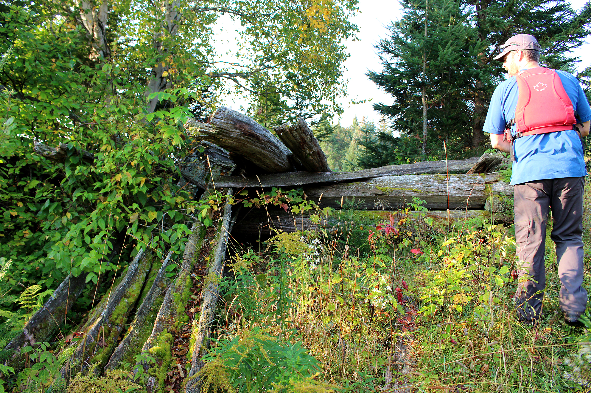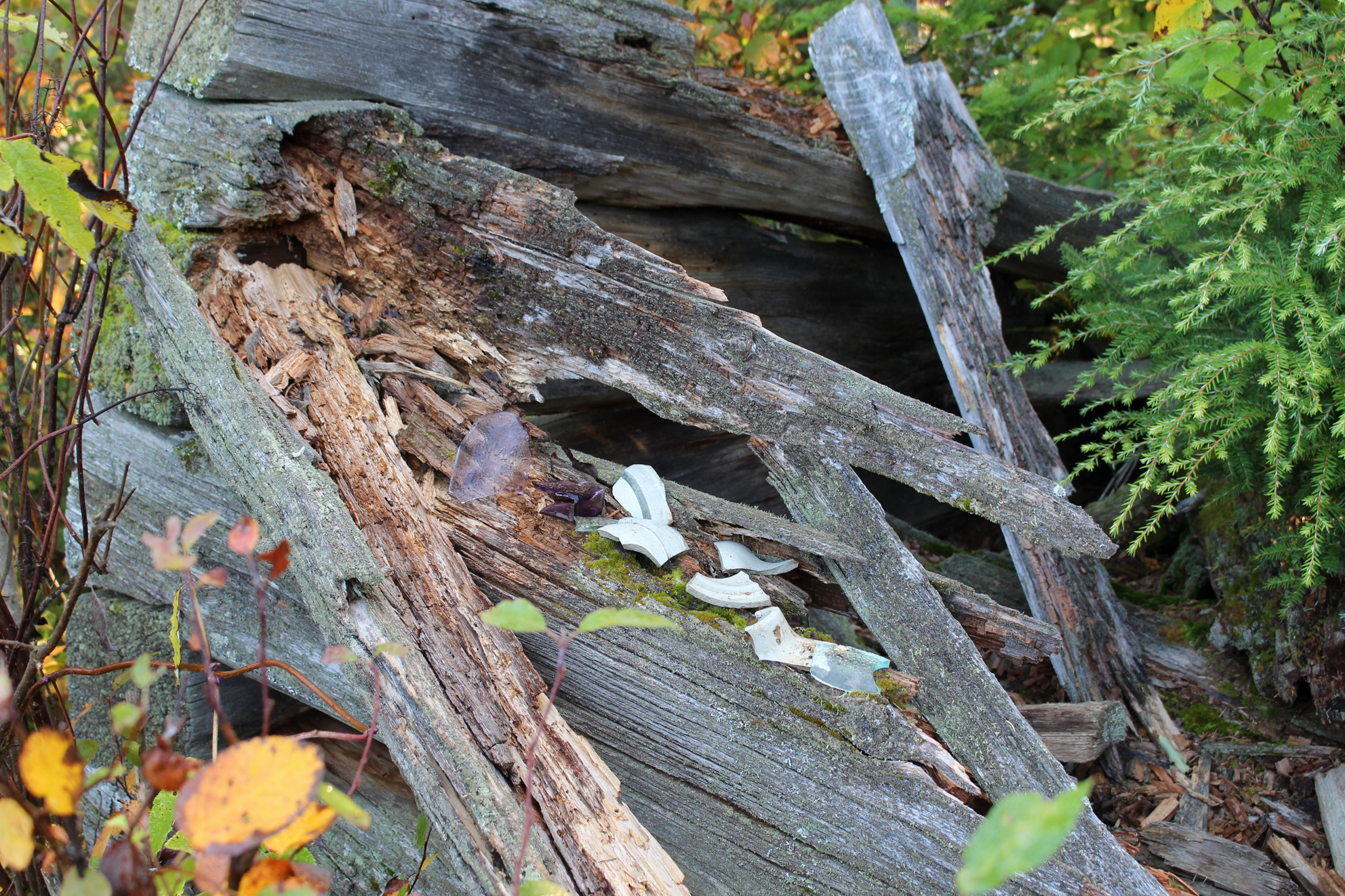 While on White Trout Lake we checked out the remains of the McLachlin Brothers Depot Farm on the north side of the lake. You can observe from the canoe where the depot farm was as it still retains the look that it was once cleared land. As we explored the area it was now overtaken by brambles, what looked like wild strawberry plants, and an interesting fruit tree. With a little more exploring we also found what little remained of any structures that were once built here. The farm was created by the McLachlin Brothers who, along with other lumber entrepreneurs such as J.R Booth, created a business of supplying lumber to the growing cities in the United States by driving down logs to mills. The depot farm located here supplied lumber camps and there may have also been a few crops and even the odd livestock at this location. With what appeared to be an old cherry tree plus wild bramble fruit around the area we also found some bear scat, so we made sure we were quite vocal while we were exploring. Other items we found were a few buckets, and some old pottery and glass.