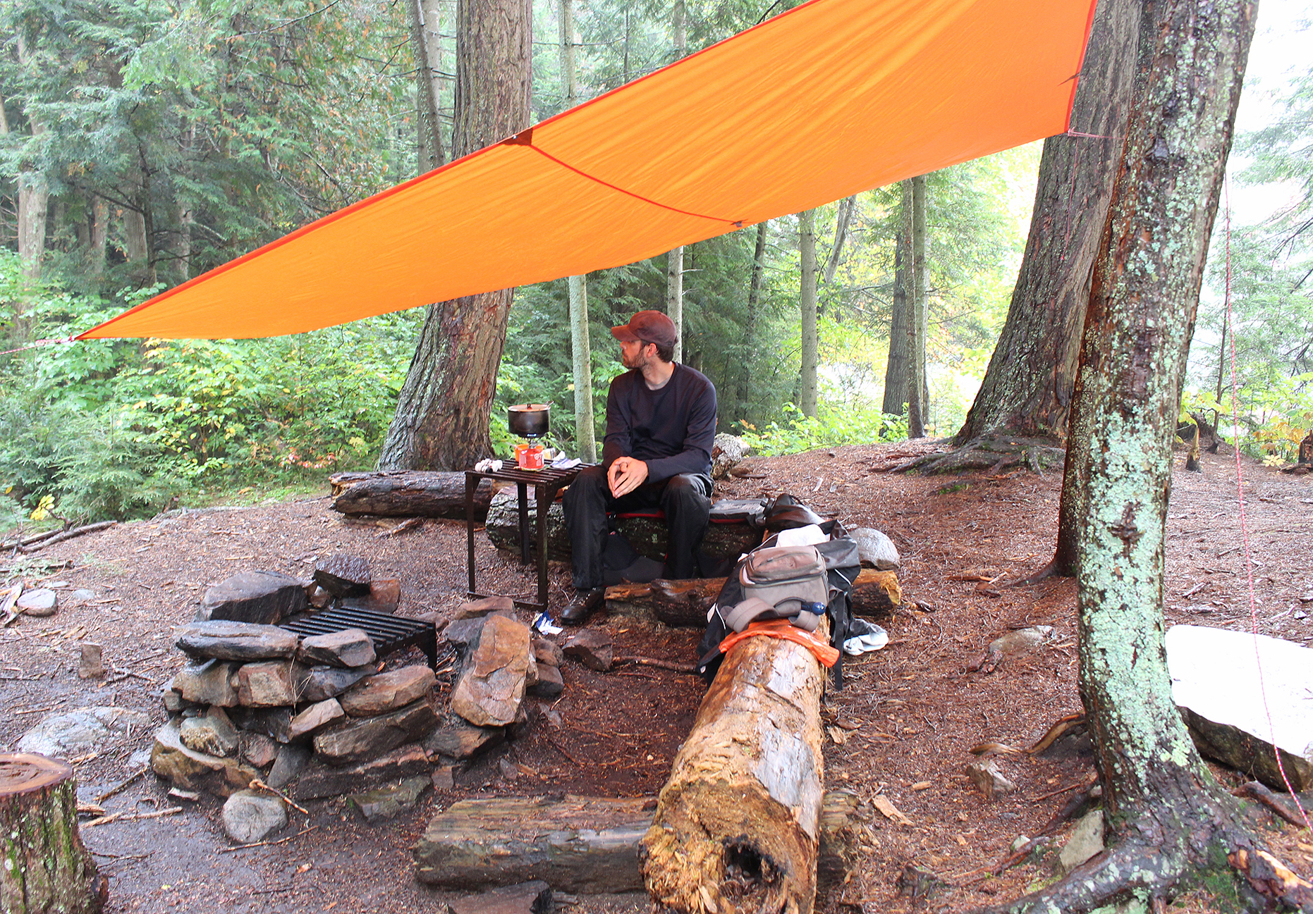 We put on our rain jackets, covered our backpacks with our rain covers, and made our way to the put in at Potter Lake which was a little tricky with quite a few rocks. As we began our last paddle for the day on Potter Lake, the rain picked up even more and we wished we also put on our rain pants. We paddled past sites that, according to the map, looked like they backed onto a marsh, a recipe for mosquitoes. We hoped to get the second last site next to the road, but it was already occupied. We settled on the most southern site on Potter Lake which had a nice fire pit (though in this rain it would be a no go) and a nice flat spot to launch and bath. Arriving around 3pm we made pretty good time today, and after quickly setting up the tent we went inside to change into dry clothes. Around 6:00pm the rain let up and we ventured out of the tent to put up the tarp above the seating area for a quick supper. No fire tonight to keep the bugs away so we retreated to the tent early this evening.