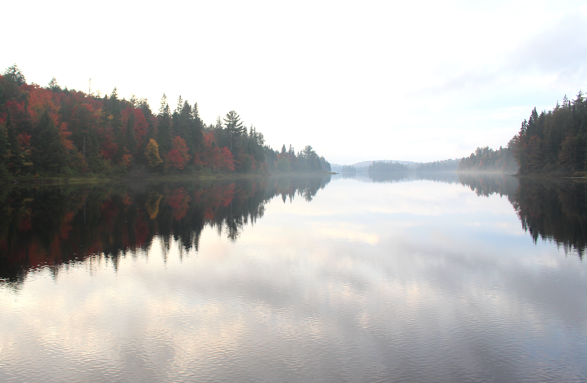 We woke up before sunrise (because we are on vacation) and made it onto the water and fog by 8:20 am. The fog was so thick that we had a hard time finding the 710 metre portage from Hogan Lake to the Little Madawaska River. While trying to find our way we ran into a family of River Otters that were not very happy to see us. While one of the parents kept swimming ahead of our canoe, popping up once in a while to chuff at us, the rest of the group swam to shore and ran off into the bush.