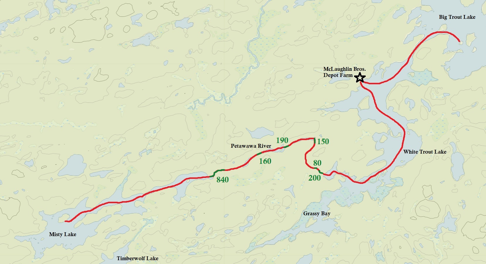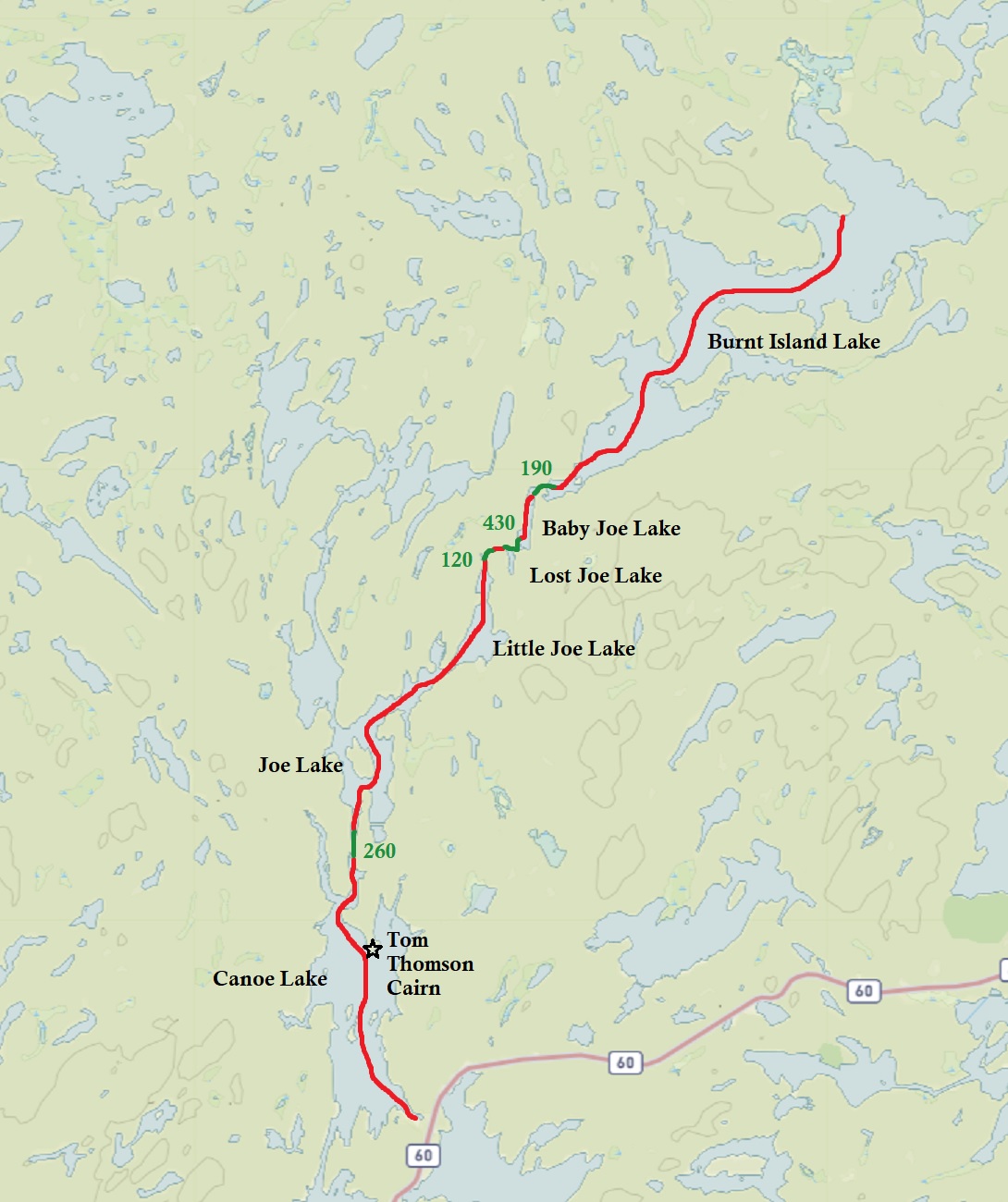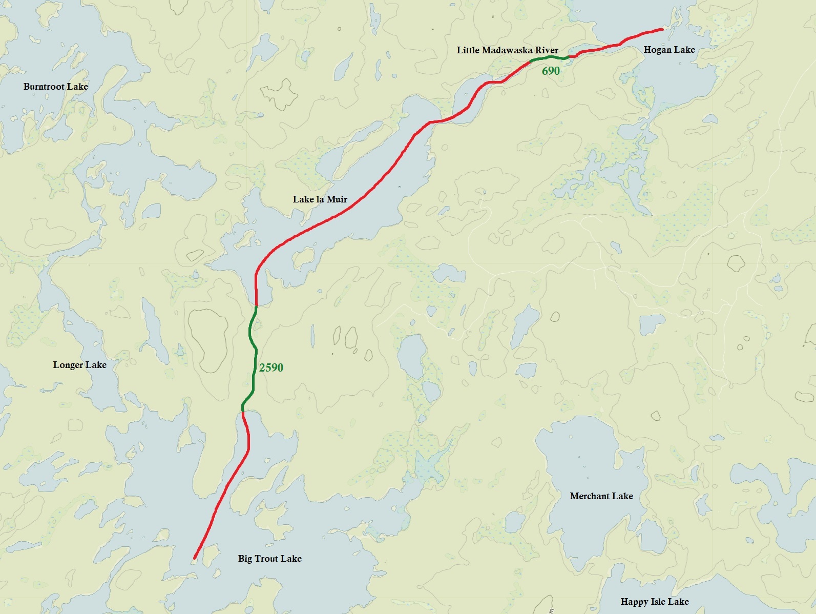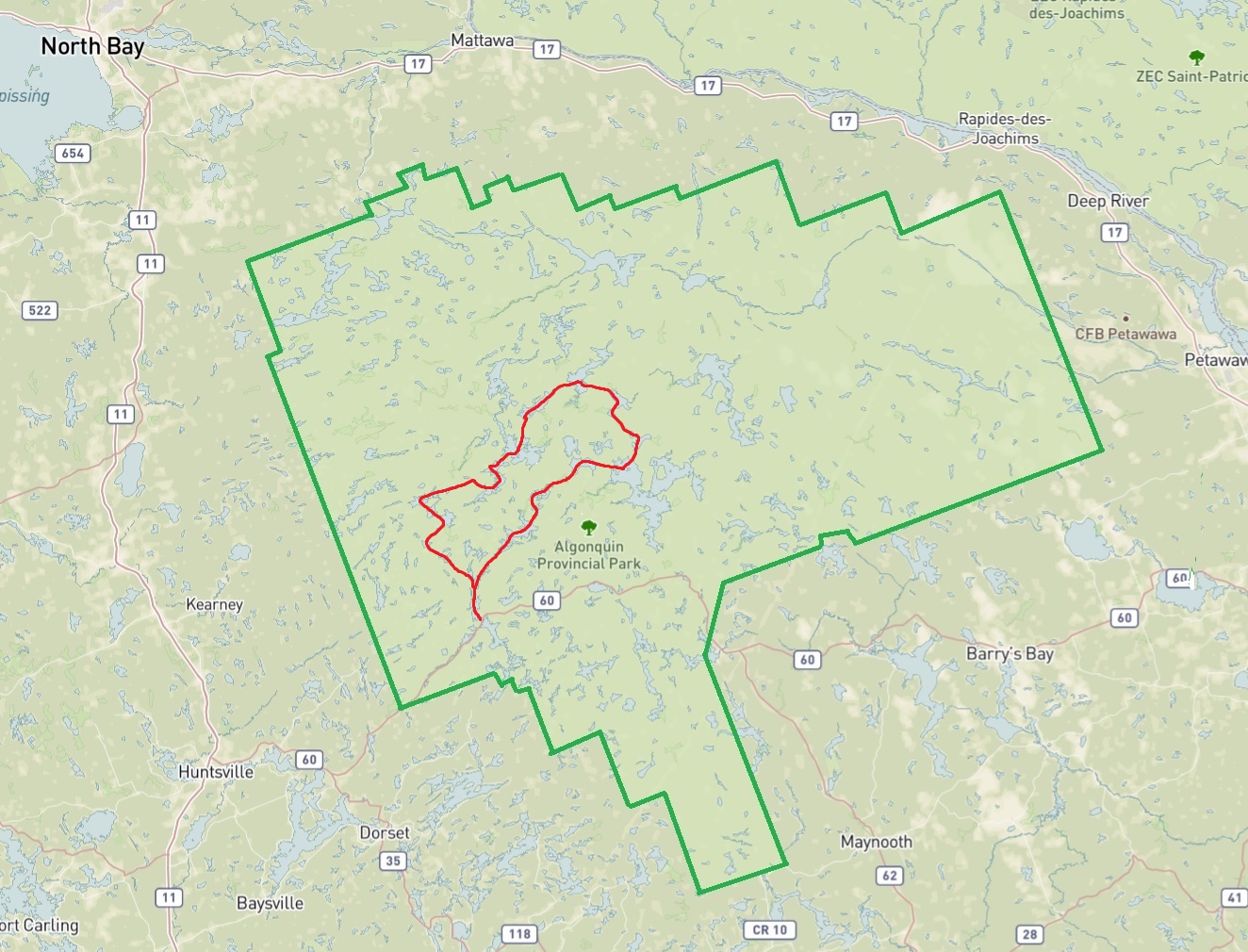 Route: Canoe Lake – Joe Lake – Little Joe Lake – Baby Joe Lake – Burnt Island Lake – Little Otterslide Lake – Otterslide Lake – Mike’s Lake – Shiner Lake – Happy Isle Lake – Hailstorm Bay – Lake Opeongo (North Arm) – Proulx Lake – Crow River – Little Crow Lake – Big Crow Lake – Hogan Lake – Little Madawaska River – Lake La Muir – Big Trout Lake – White Trout Lake – Petawawa River – Misty Lake – Timberwolf Lake – McIntosh Lake – Straight Shore Lake – Rosswood Lake – Brule Lake – Potter Lake – Potter Creek – Canoe Lake