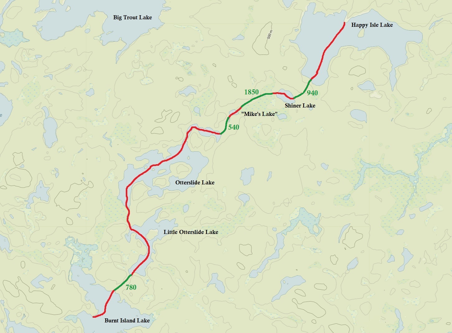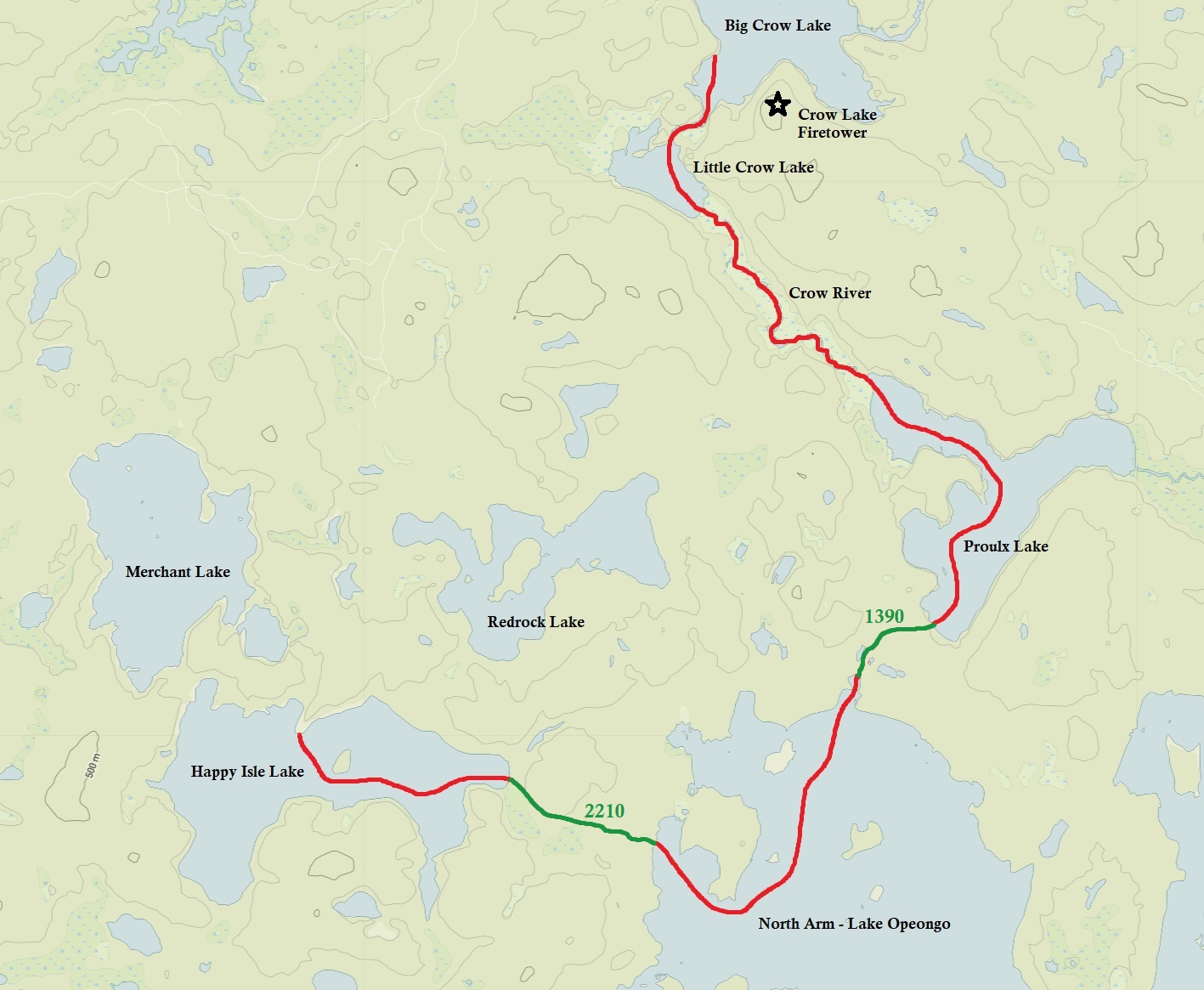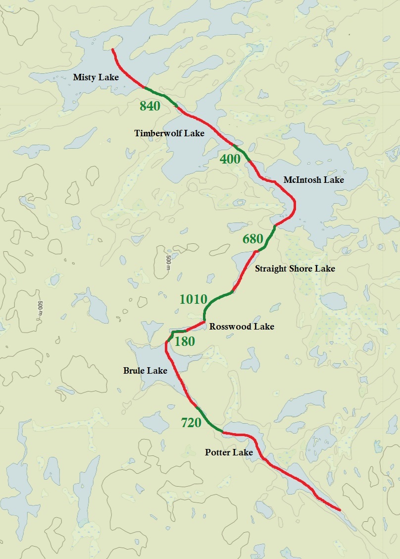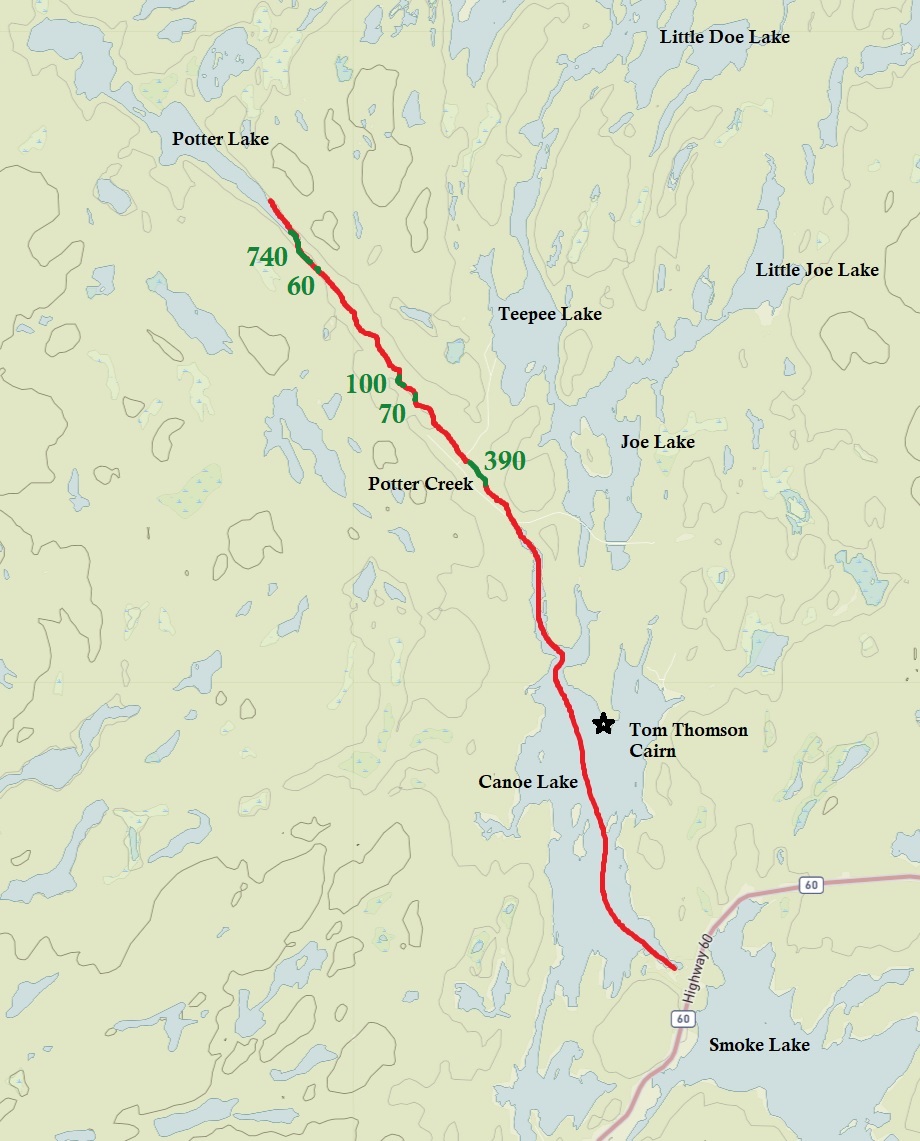 Route: Canoe Lake – Joe Lake – Little Joe Lake – Baby Joe Lake – Burnt Island Lake – Little Otterslide Lake – Otterslide Lake – Mike’s Lake – Shiner Lake – Happy Isle Lake – Hailstorm Bay – Lake Opeongo (North Arm) – Proulx Lake – Crow River – Little Crow Lake – Big Crow Lake – Hogan Lake – Little Madawaska River – Lake La Muir – Big Trout Lake – White Trout Lake – Petawawa River – Misty Lake – Timberwolf Lake – McIntosh Lake – Straight Shore Lake – Rosswood Lake – Brule Lake – Potter Lake – Potter Creek – Canoe Lake