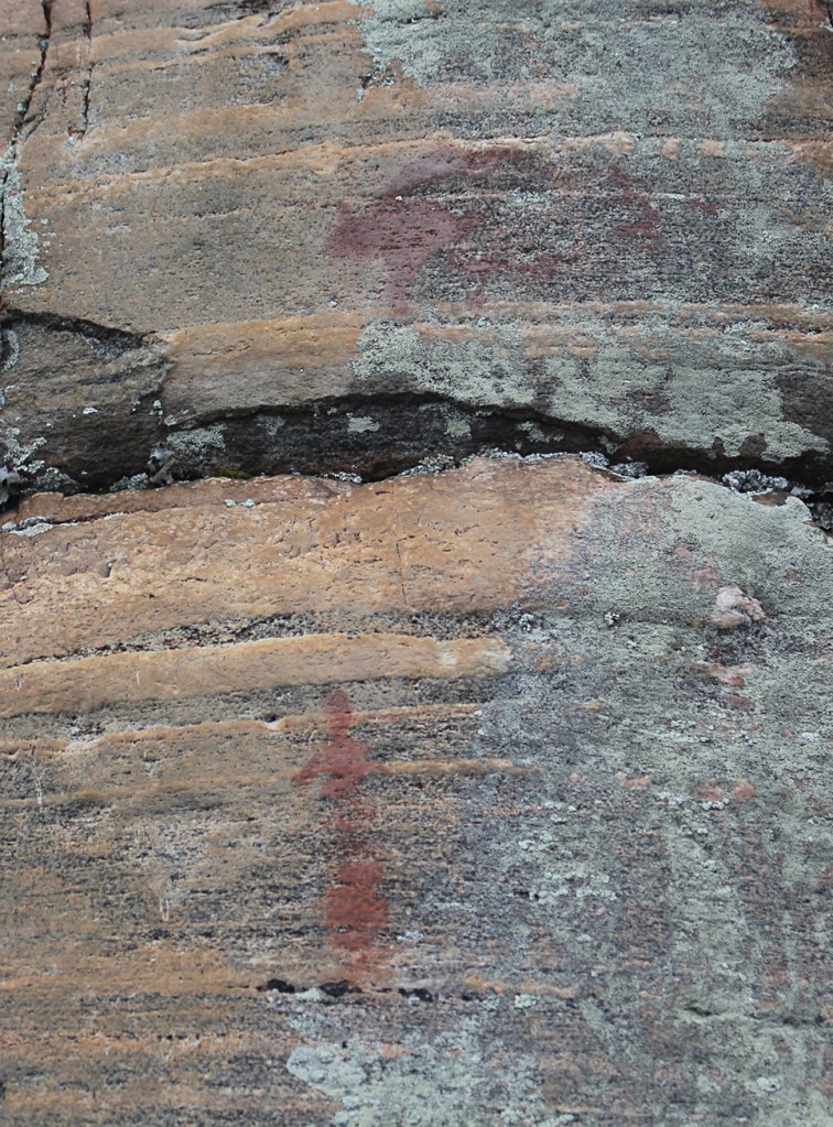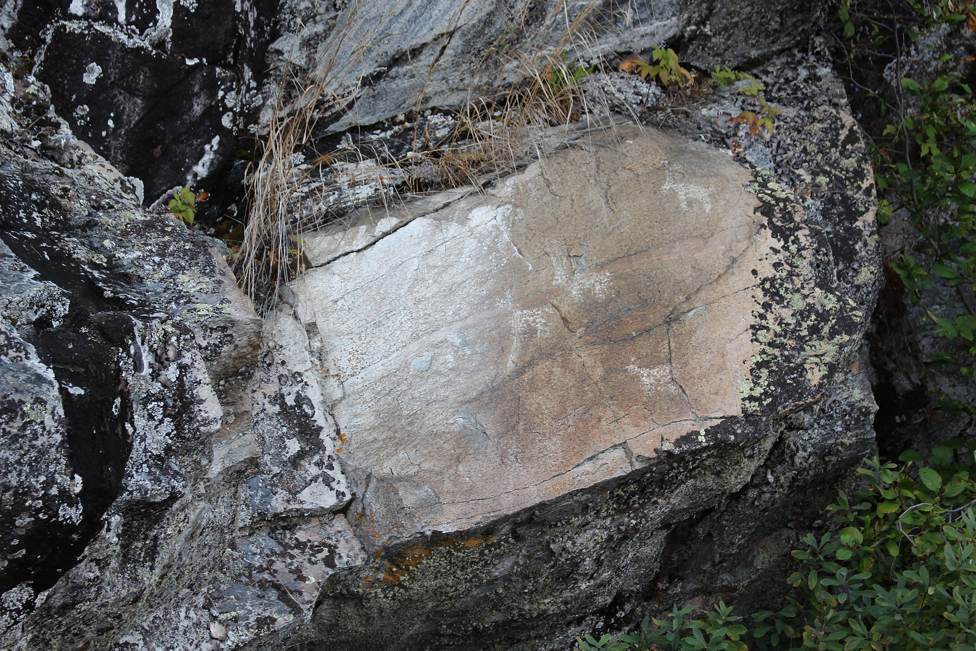 Back to our actual trip it was also around this time, after meeting these two groups of guys from Reid Lake, that Marianne realized she hasn’t seen another girl since day one of our trip. After a few more short portages through Summer, Sultry and Silence Lake, we entered Agnes Lake. Before entering Agnes Lake we turned around and saw a wall of grey clouds creeping up behind us from the west, so rain on it’s way yet again. Paddling up the western shoreline of the large Agnes Lake we found the park’s only known petroglyph, which depicts either four caribou or deer. A short 50 metre paddle north of that and we saw another pictograph. This one was an image of two rabbits, though only one of them is recognizable.