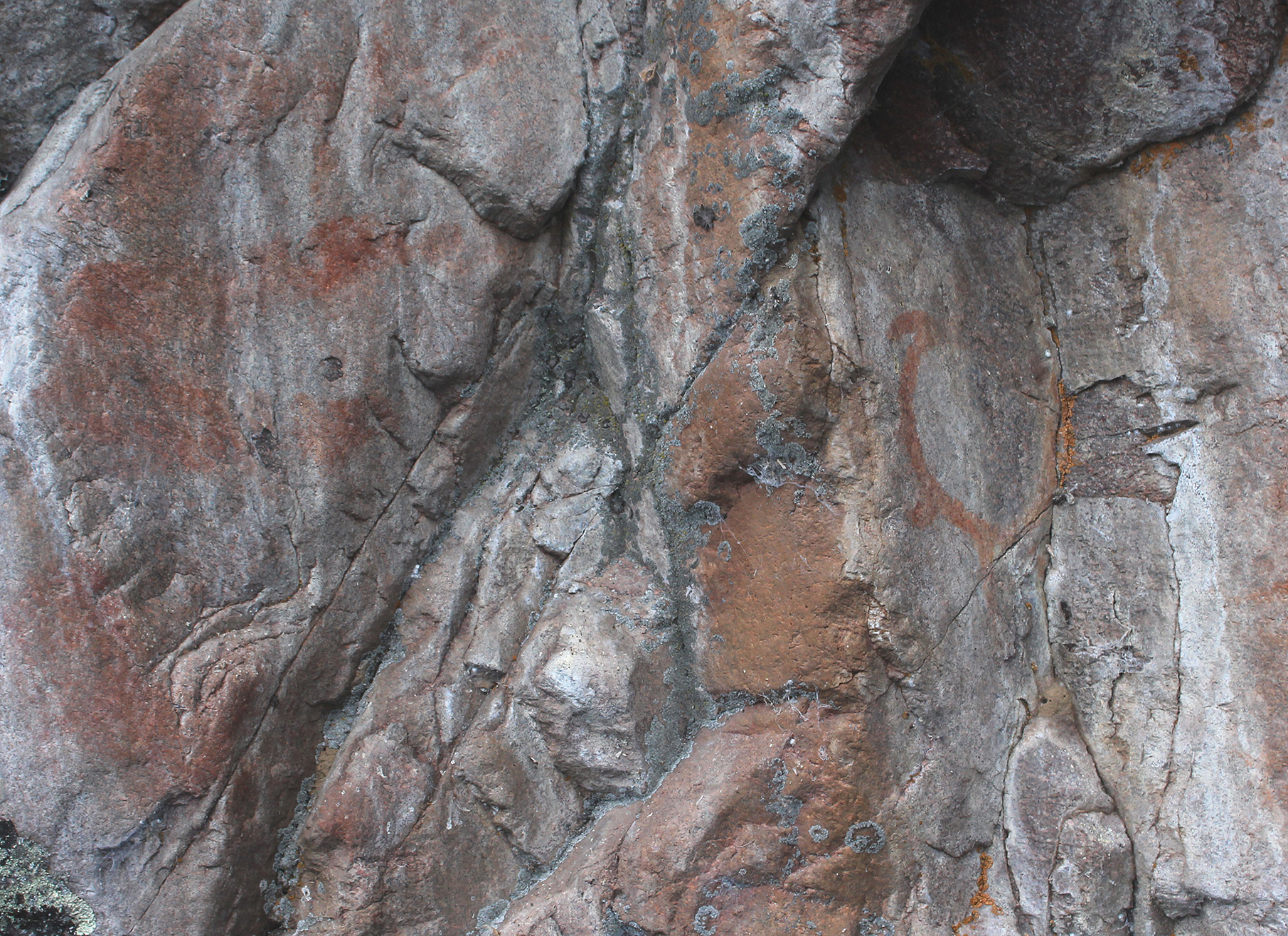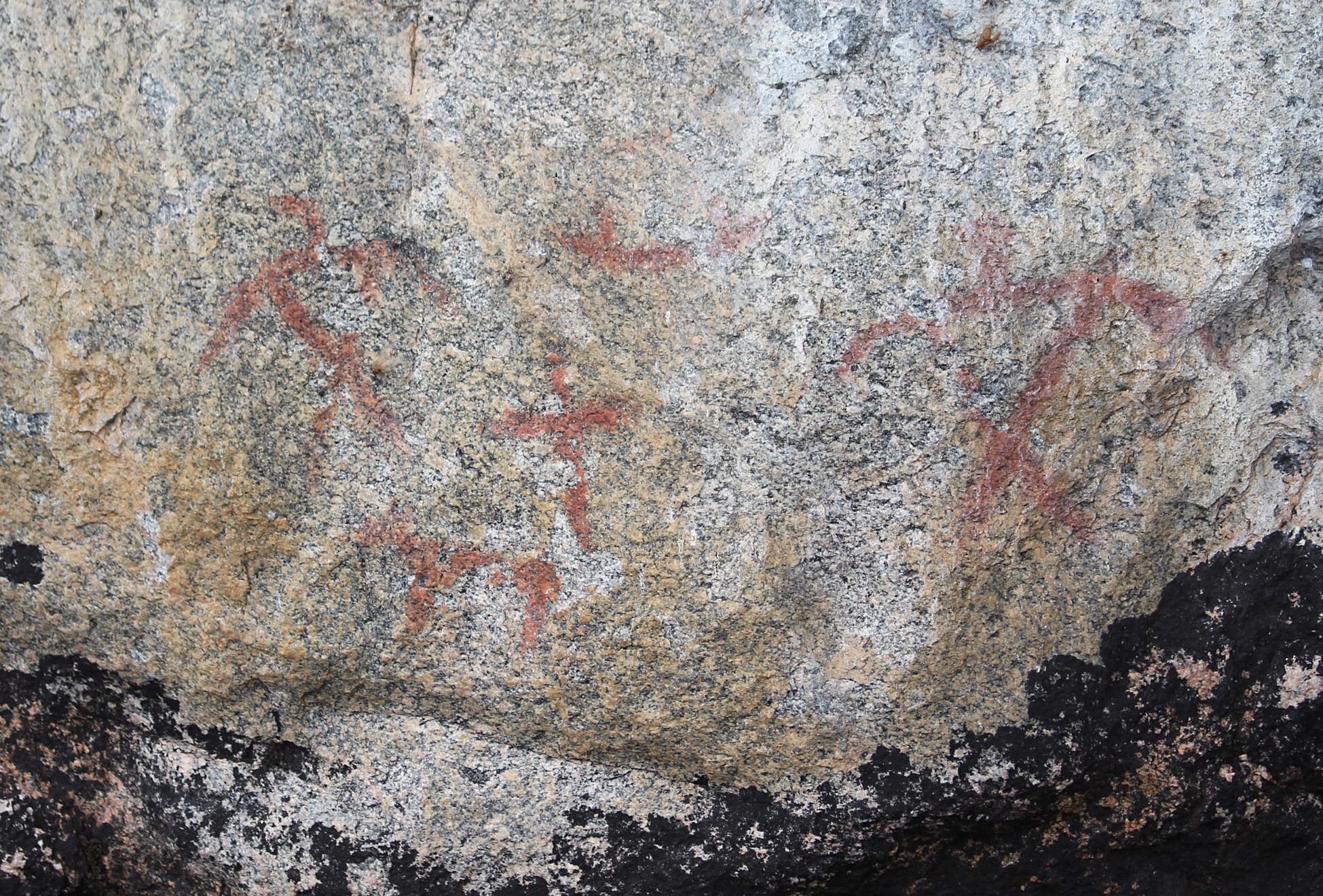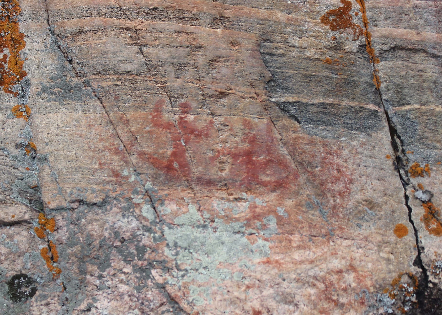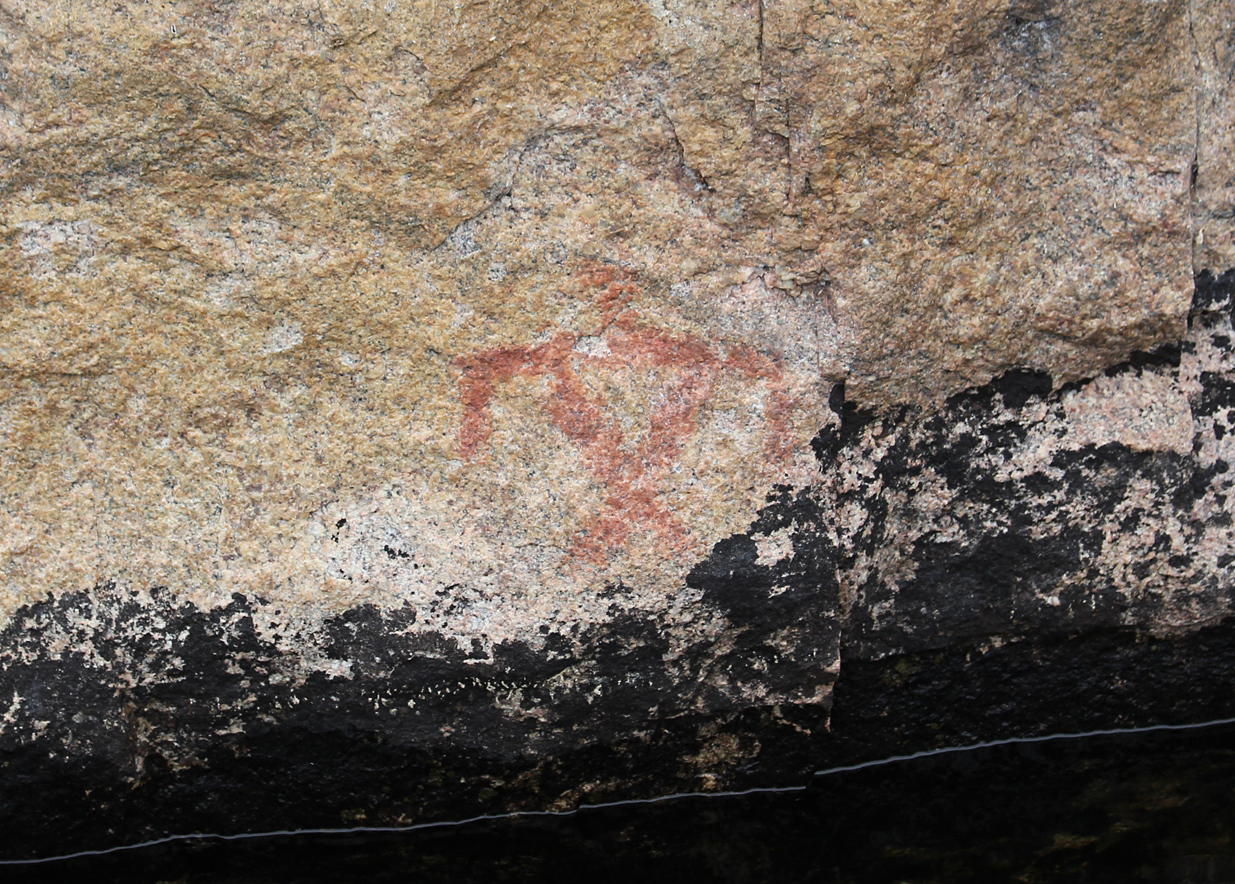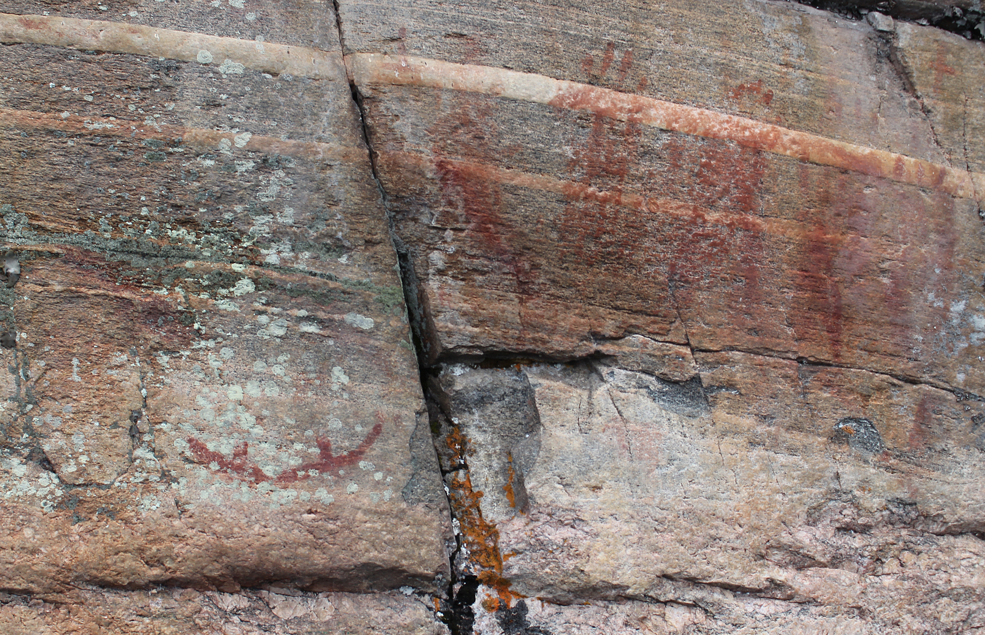 Just around the corner from our site is another great pictograph site. This one had a bear, an abstract shape, two people in a canoe, and two Maymaygwayshi in a canoe. The Maymaygwayshi to the Ojibway people were short hairy-faced mischievous little men who lived along the waters of rivers.