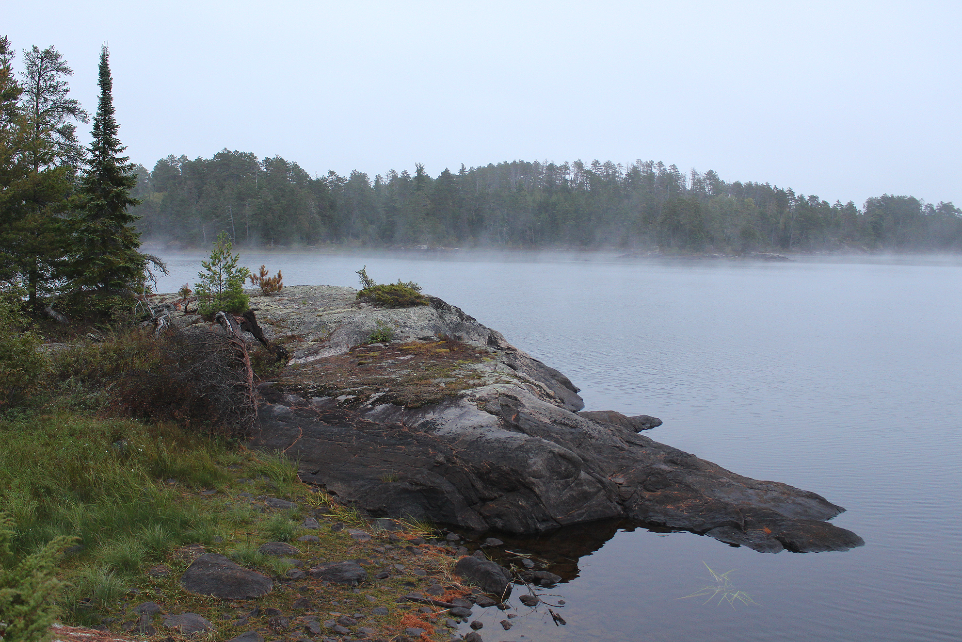 Go time this morning! All rested we got up at 5:30 am, had a quick tea with some Kind Bars, and were back on the water by 7:15 am. It was a calm and foggy morning and the air was a lot cooler than the water as we could feel warm air rising off of it. We paddled northwest to the 390 metre portage into Russell Lake. The morning fog created a damp mist which left us slightly chilled as we paddled.
