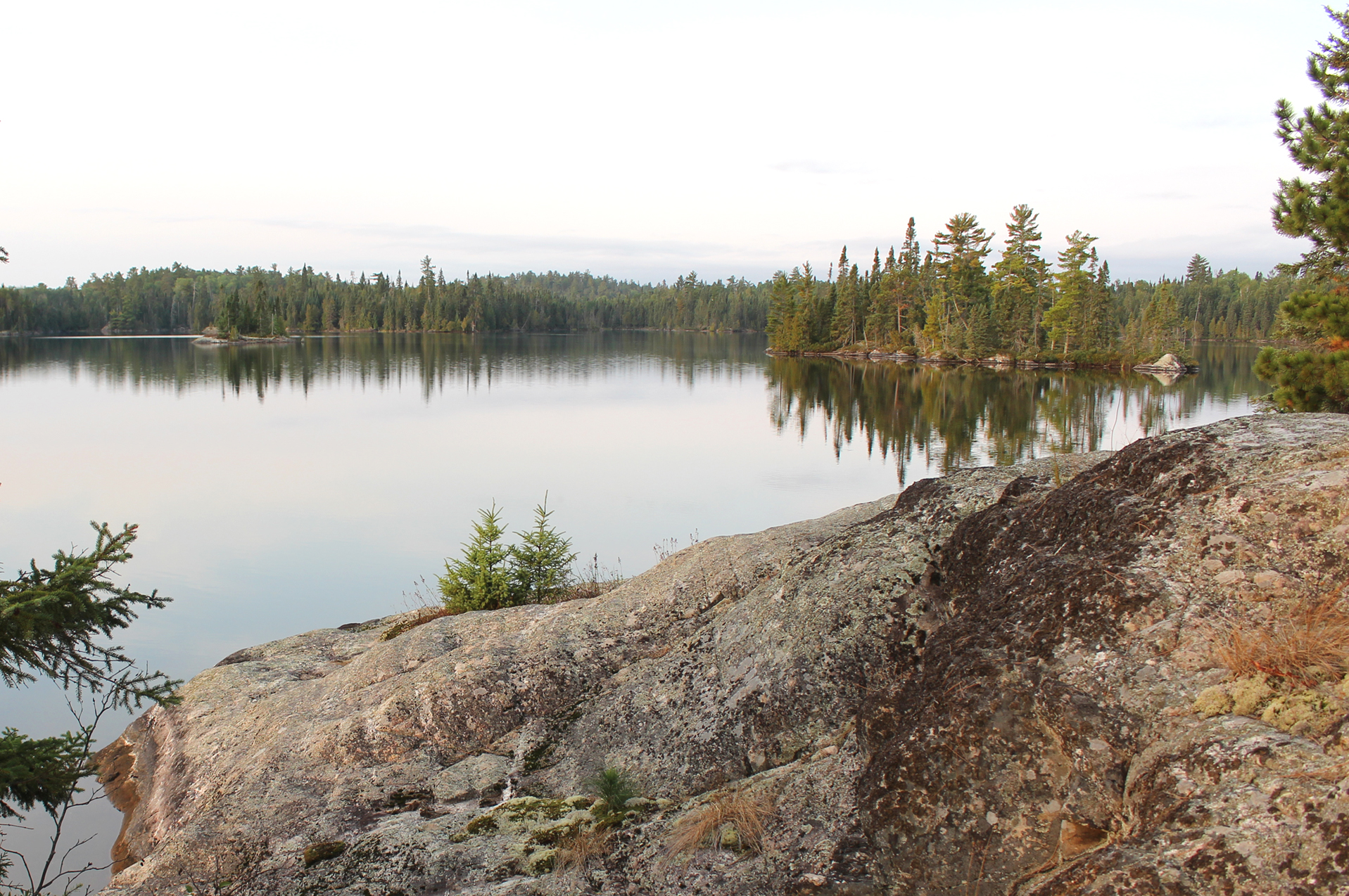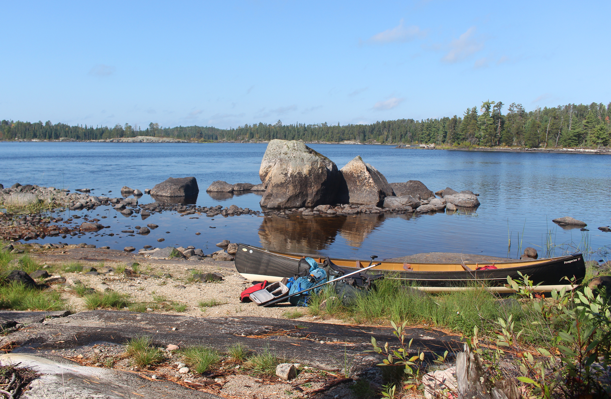 One last struggle with headwinds on Walter Lake and we arrived at the large island site later than we expected at 5:15 pm. This is the only island site that we know of on Walter Lake. The site was mainly out of the wind, with a nice flat spot for a tent, and a large smooth rock for an easy launch with the canoe.