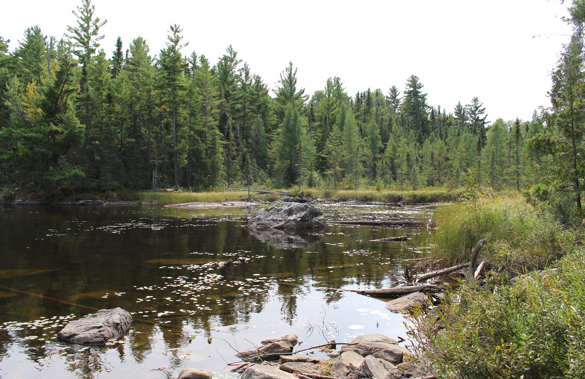 This morning we woke up at 6:30 am, and in a hail of mosquitoes we quickly took down the tent, packed up our stuff, and got the hell off of that island! The mosquitoes hung out with us in our canoe to almost our first portage, an 80 metre back into Kahshahpiwi Creek. We are now beginning to retrace our route.