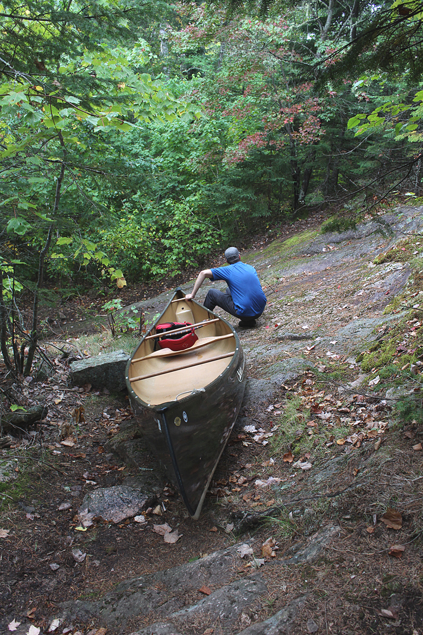 After heading back around the peninsula we made it to the longest portage of the trip, the 1,230 metre “Yum Yum portage”. As with most named portages, this one had some character to it. The Yum Yum portage is rugged, steep, and even has a huge slab of rock on a 40 degree angle that requires you to push the canoe down first and then slide down on your butt afterwards. It was a workout for sure and we got our sweat on. We had a little bit of light rain this morning and we were happy that the rocks along this portage were not particularly slippery because if they were the portage would have been a lot more difficult!