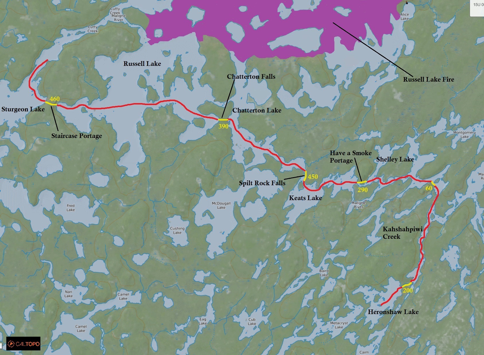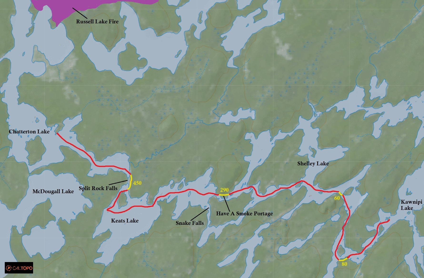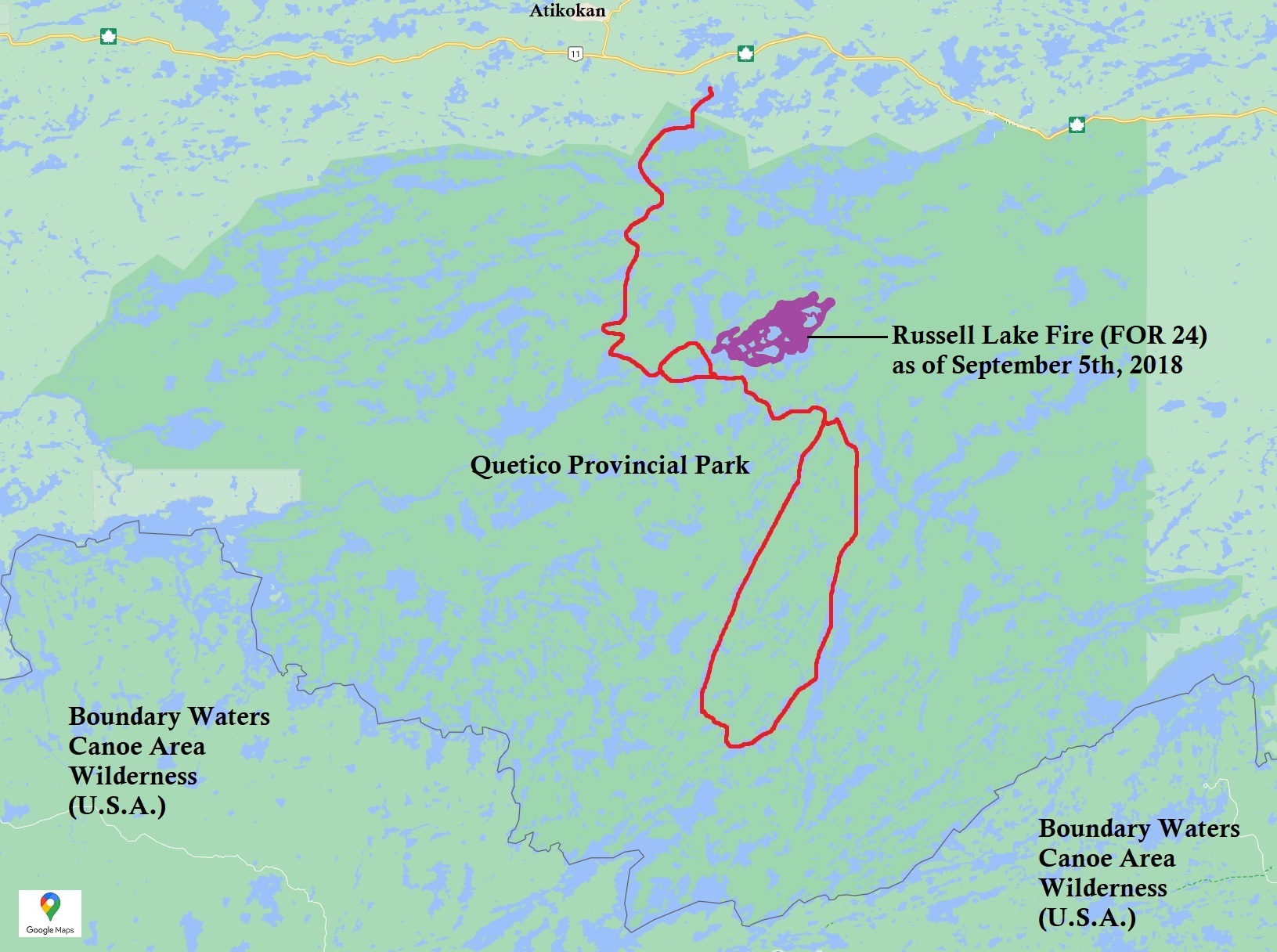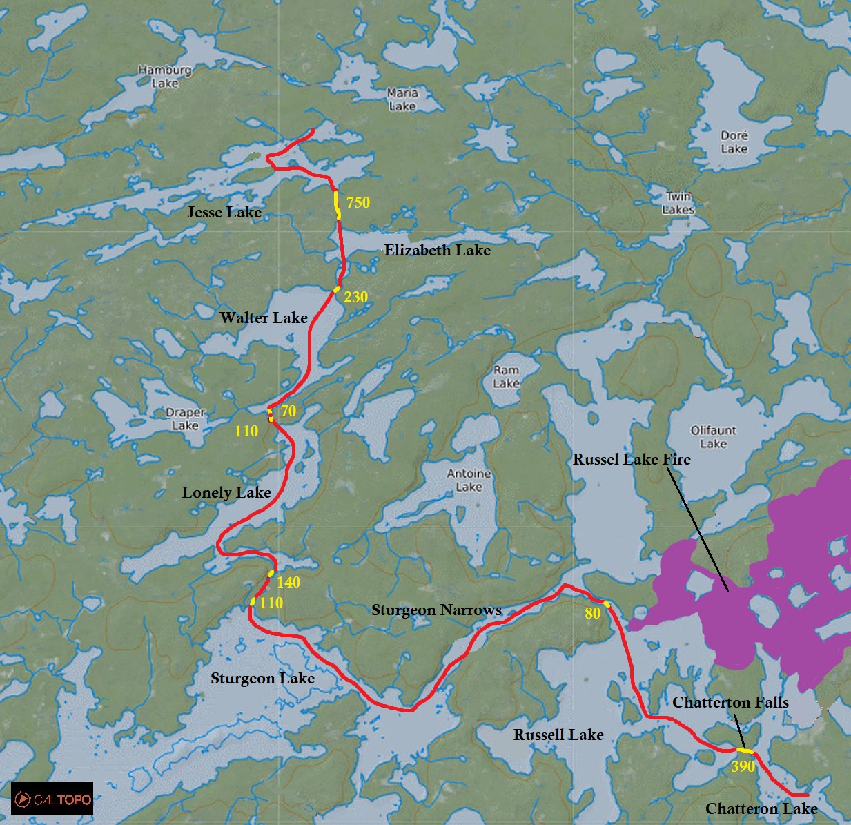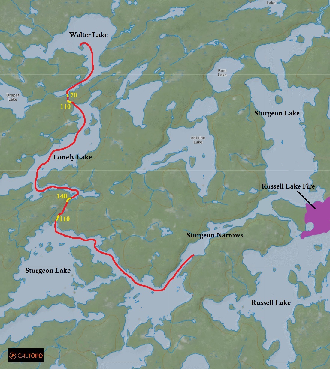 On July 29th on the north shore of Russell Lake, a lightning strike started a forest fire. At first the fire was only a mere 80 hectares and looked like it wasn’t going to spread that much, but conditions changed and it grew to 2,800 hectares a couple of weeks before our canoe trip. The fire lead to lake closures including the “B-chain” of lakes (Bisk, Beg, Bud) which was part of our itinerary for our first and last day launching from Stanton Bay. As we approached the week of our canoe trip we decided to modify our route a bit by launching from Nym Lake, paddle west to Sturgeon Lake, and head east to Russel Lake via the 460 metre “staircase portage”. Unfortunately, the easier “Russell Rapids Portage” into Russel Lake was also closed due to the fire.