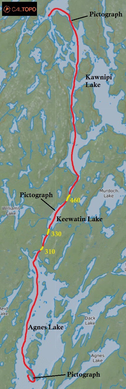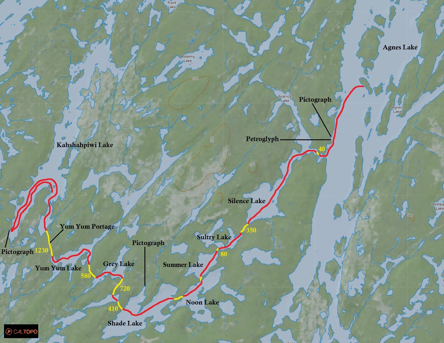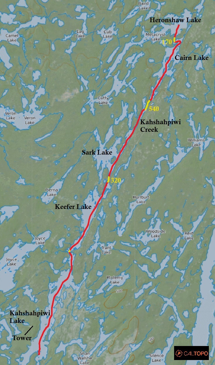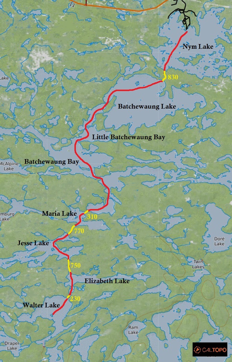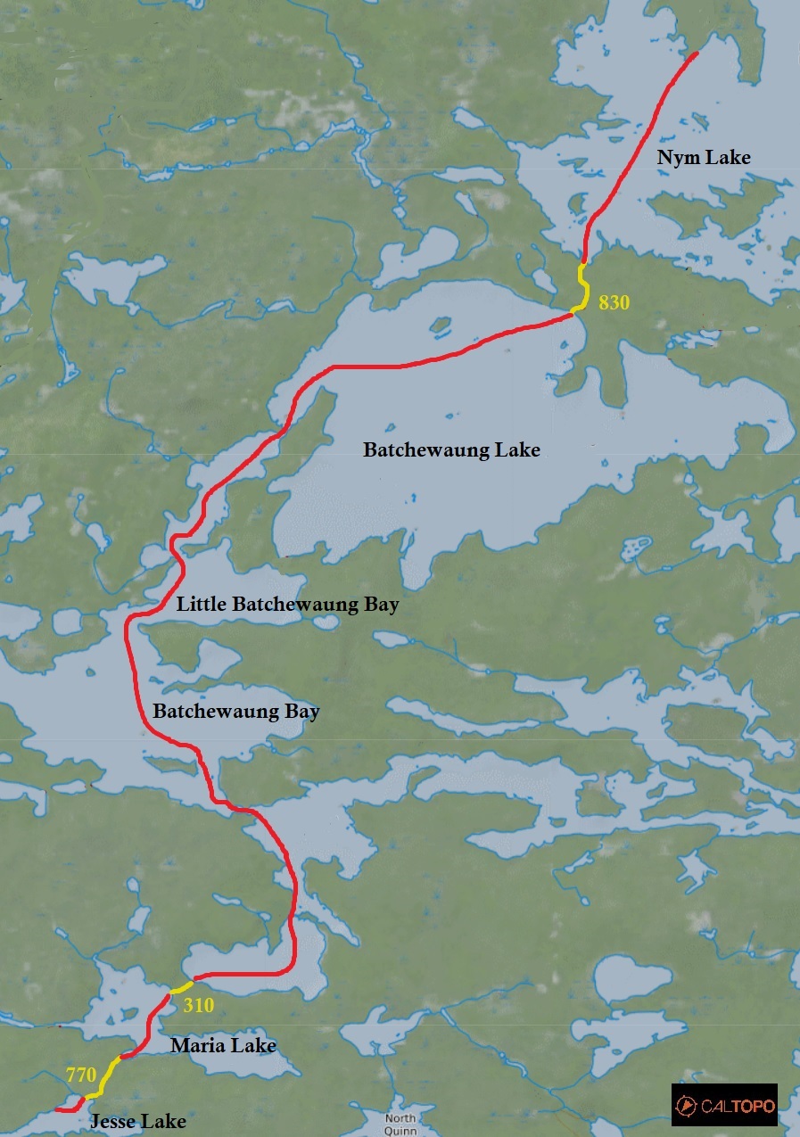 Route: Nym Lake – Batchewaung Lake – Little Batchewaung Bay – Batchewaung Bay – Marian Lake – Jesse Lake – Elizabeth Lake – Walter Lake – Lonely Lake – Sturgeon Lake – Russel Lake – Chatterton Lake – Keats Lake – Shelley Lake – Kahshahpiwi Creek – Heronshaw Lake – Cairn Lake – Sark Lake – Keefer Lake – Kahshahpiwi Lake – Yum Yum Lake – Grey Lake – No Name Lake – Shade Lake – Noon Lake – Summer Lake – Sultry Lake – Silence Lake – Agnes Lake – Keewatin Lake – Kawnipi Lake – Kahshahpiwi Creek – Shelley Lake – Keats Lake – Chatterton Lake – Russell Lake – Sturgeon Lake – Lonely Lake – Walter Lake – Elizabeth Lake – Jesse Lake – Maria Lake – Batchewaung Bay – Little Batchewaung Bay – Batchewaung Lake – Nym Lake