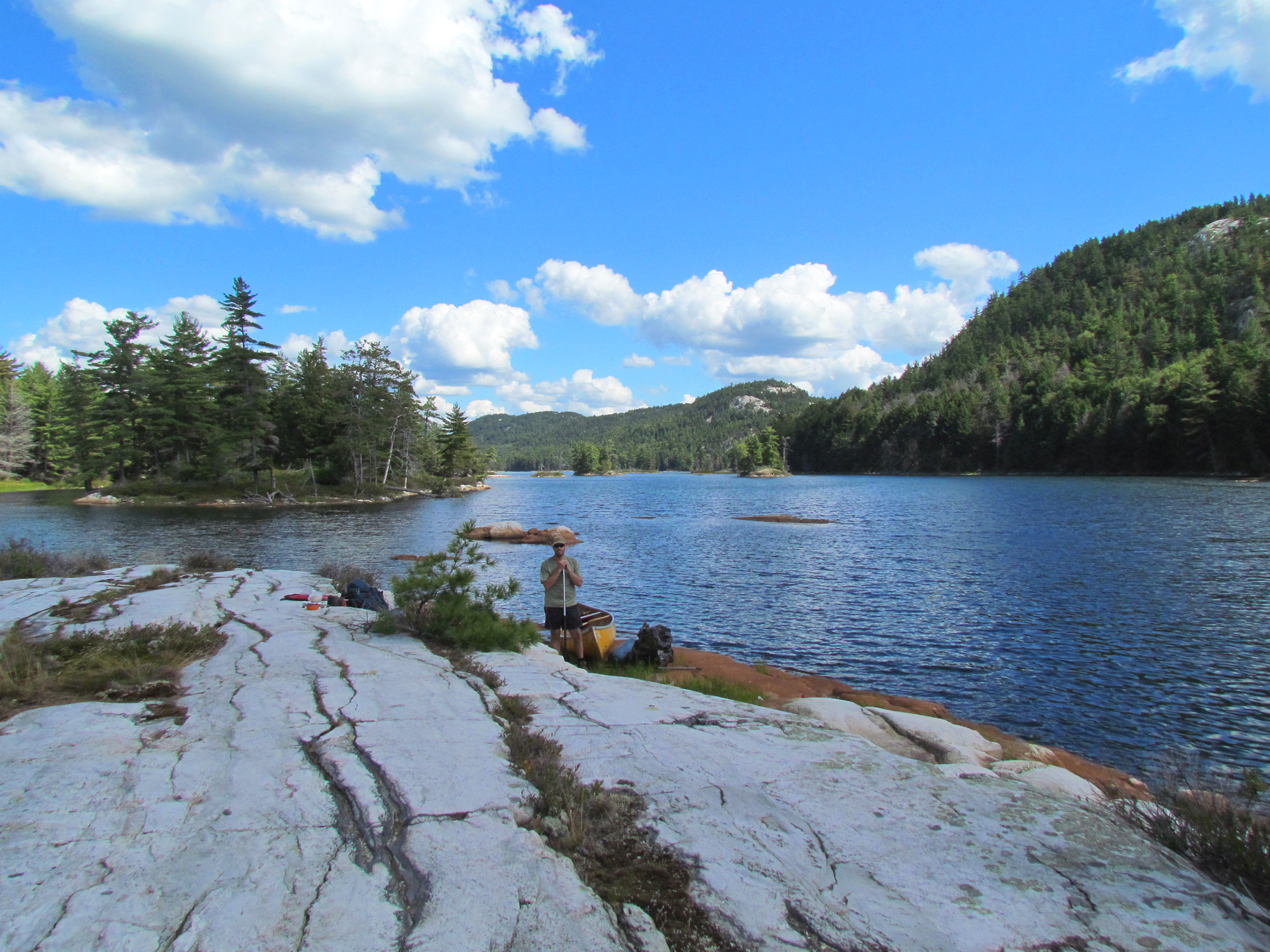 We arrived at “The Pig” just after 10:00am. This portage, one of the steepest in the park, is close to 1.5 kilometres in length. It goes over a section of the Blue Ridge range of mountains and was once an old logging road from 1908 to 1927. What remains today of this tote road includes a trail of loose rounded stones of various sizes, so this was definitely a portage that required two carries.