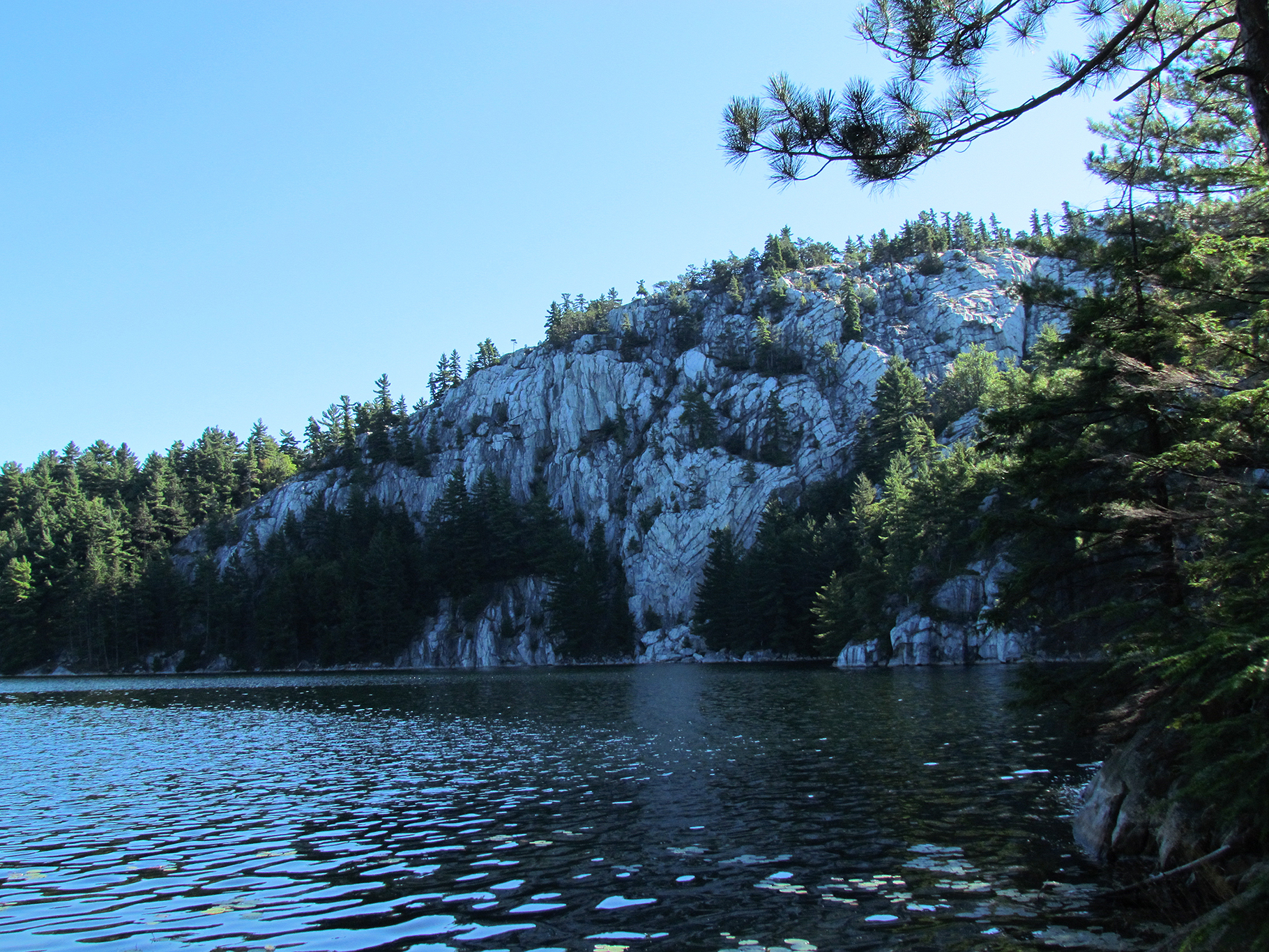 The clear waters of O.S.A Lake caused by acid rain from emissions such as Sudbury’s mining industries that, over the years lowered the pH level of the water. A survey in 2001 revealed that O.S.A Lake had a pH level of 4.9. Being surrounded by inert quartzite, recovery of this, and many other lakes in Killarney Provincial Park may take another lifetime to return to a more normal pH level. Thankfully, local mining industries have reduced their emissions. (click image to enlarge)