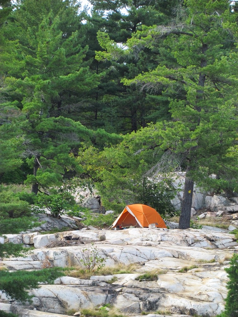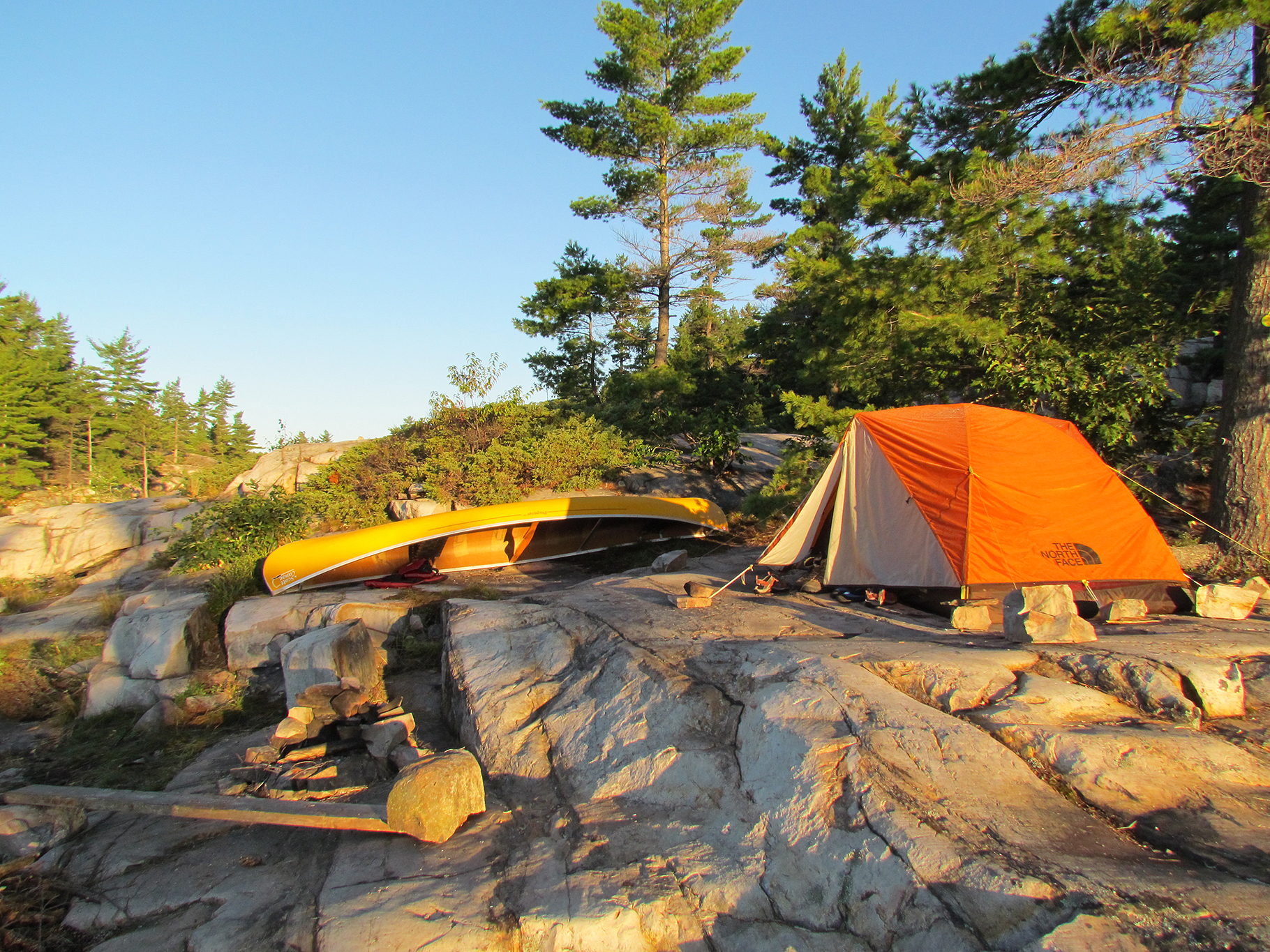 We paddled full throttle towards an island campsite we had our eyes on with no idea whether the paddlers on this lake were coming or going. We arrived at an island that had two sites on it around noon (site #118). We observed people vacate the neighbouring site shortly after we arrived, and within the hour there were new occupants paddling in. Man this section of the park is busy! Our site was pretty nice, however the thunderbox was missing the bottom front piece of wood.