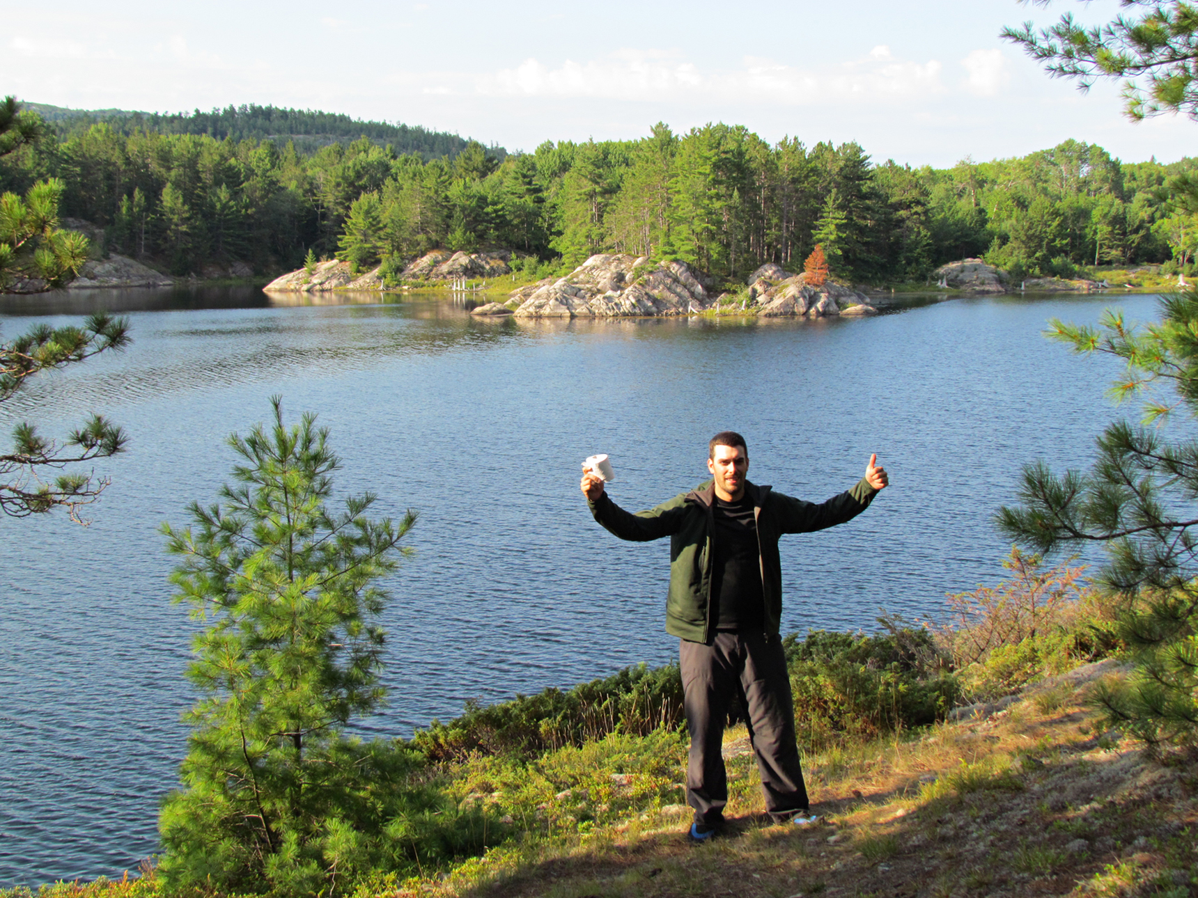 We left our site at 11:00am and made our way to Threenarrows Lake which would be the location of our next site for the night. To get to Threenarrows we had to portage a 3,160 metre long, but relatively flat, portage. Along this long portage we were right next to the white rocks of the La Cloche range, and we also viewed some beaver dams. At first we attempted a once over with this portage, but Aaron’s pack was uncomfortable so we doubled over most of it. Four hours later and we finally got all our gear and the canoe to the end of the portage. We collapsed here completely worn out and used the last of our water to make lunch as we were very hungry. Unfortunately, while attempting to sit down, Marianne accidentally knocked over the pot of water that was perched on the camping stove, completely dumping all the water out. So much for lunch! In the end we had to settle on splitting an energy bar, while taking what few sips of water that were left in our water bottle. This was definitely the low light of the whole entire trip, and left us both a little miserable.
