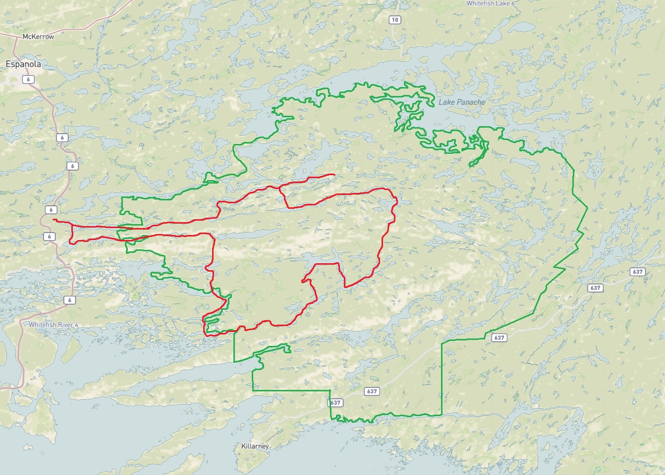 Killarney Provincial Park with our route outlined in red. (click image to enlarge)