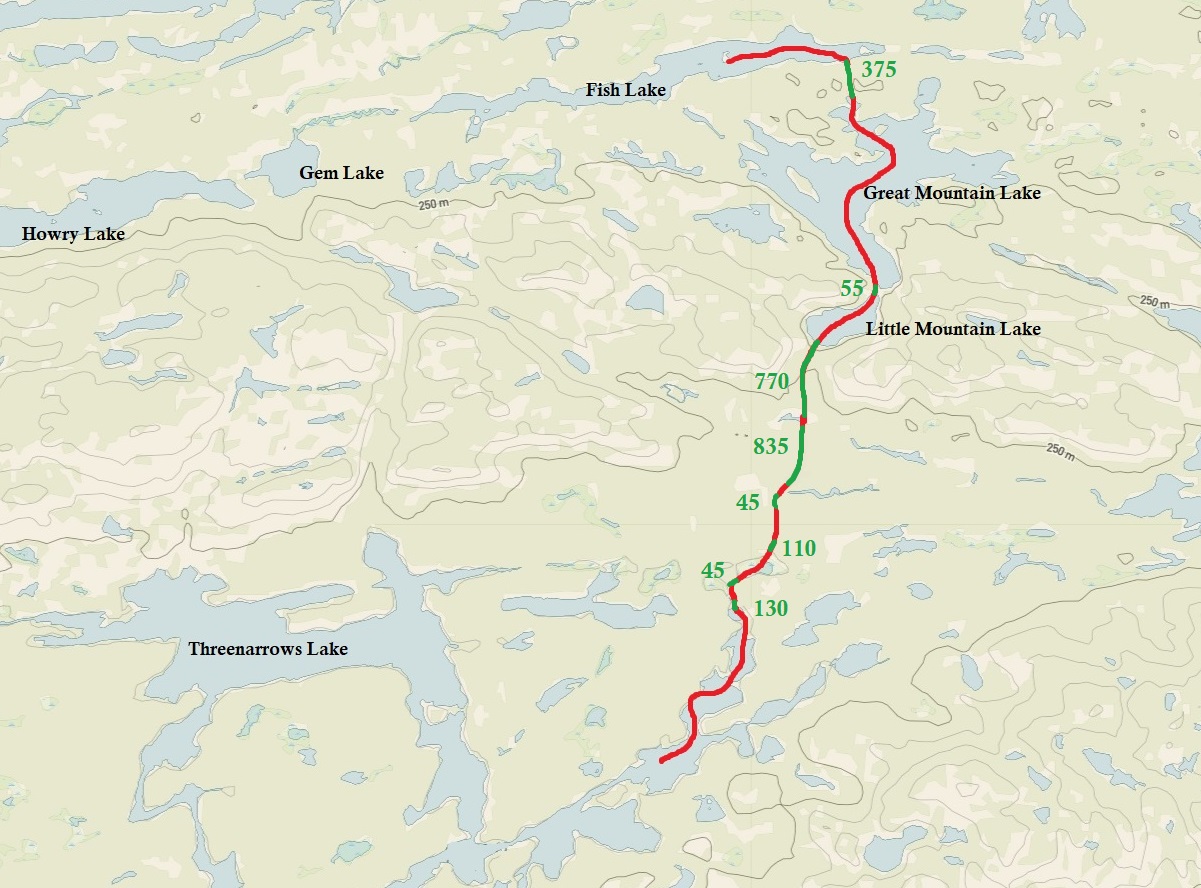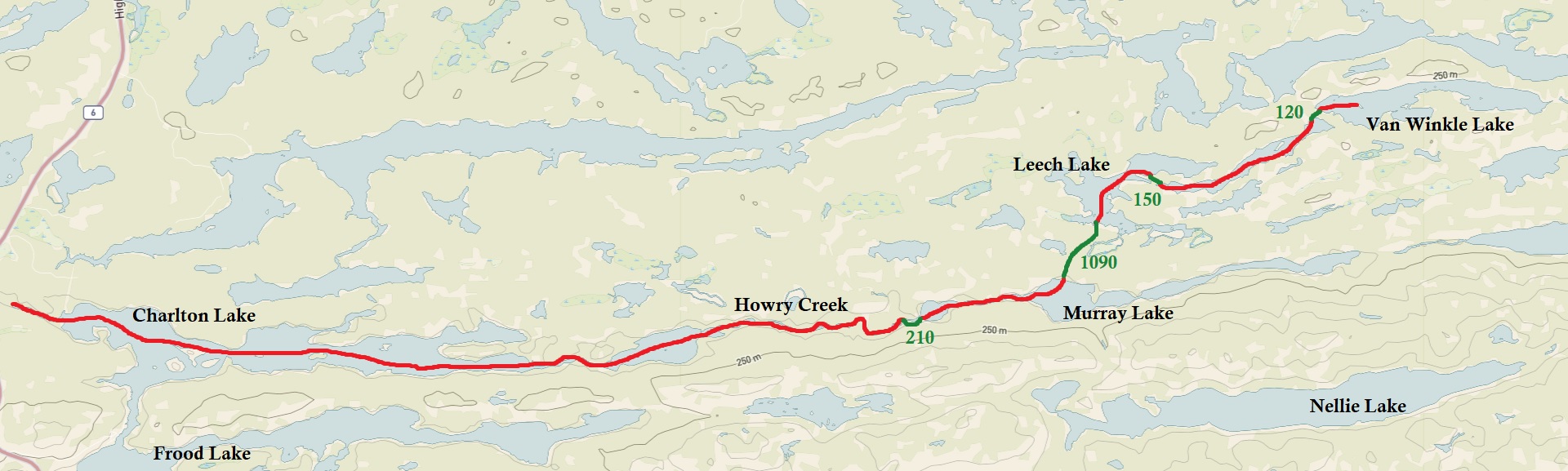 Longest Portage: 3.160 kilometres (between Killarney and Threenarrows Lake)